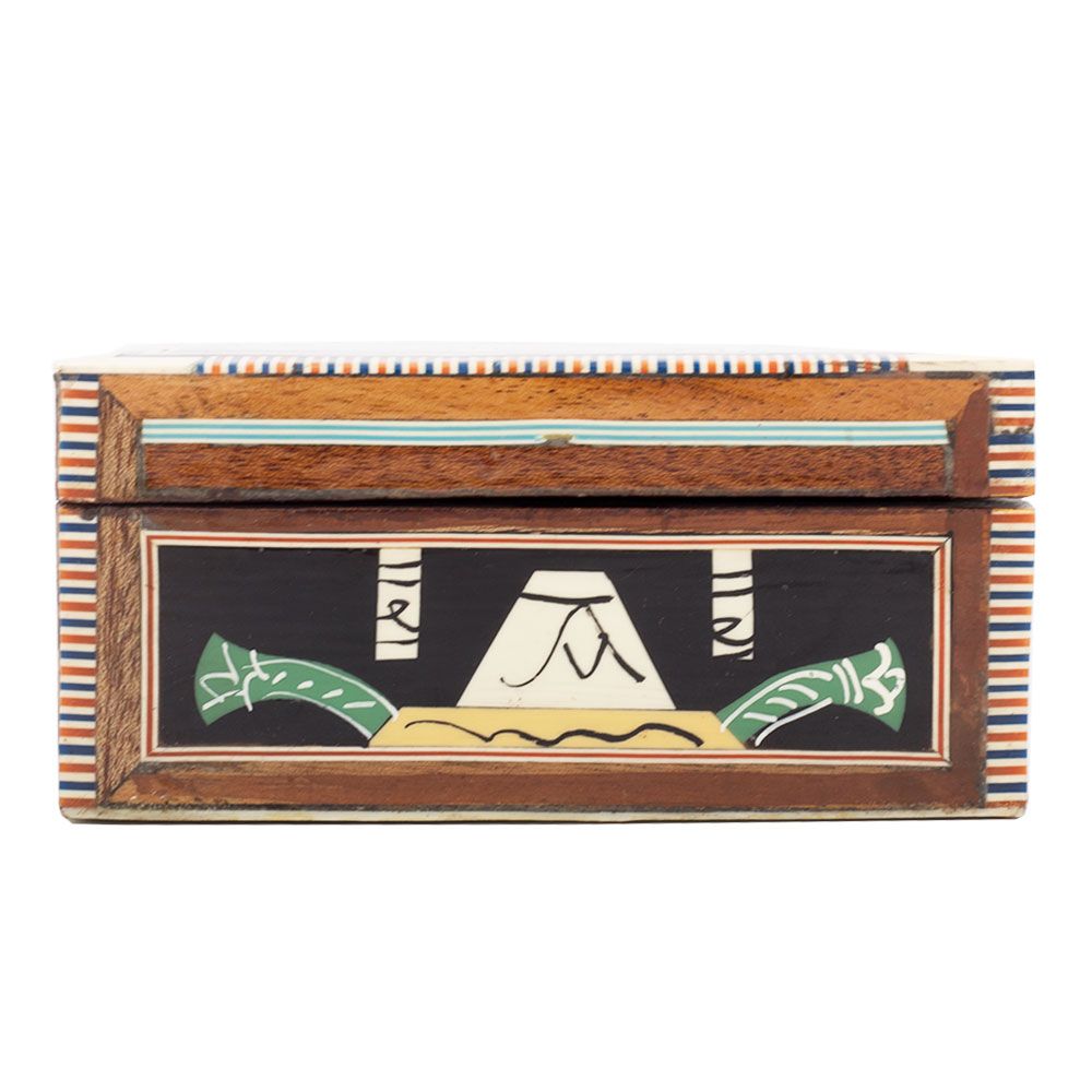 Egyptian Jewelry Box , handmade and inlaid with mother-of-pearl, designed in ancient Egyptian dancing scene, Front image
