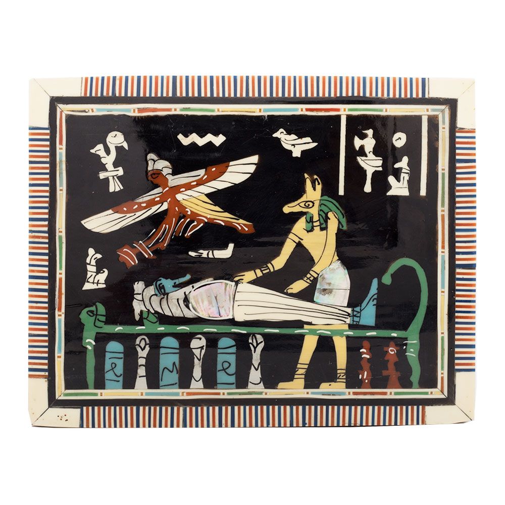 Front Image, Anubis Scene Wooden jewelry box with laid and lock, inlaid with mother of pearls, antique wooden box with laid