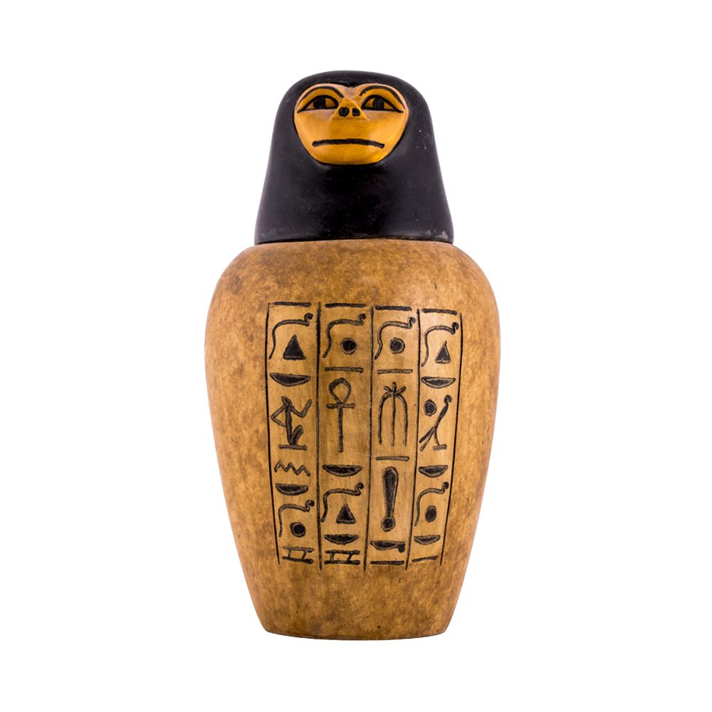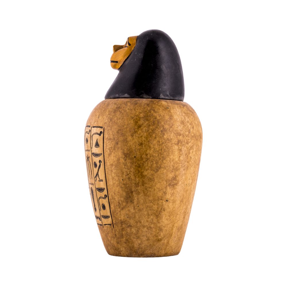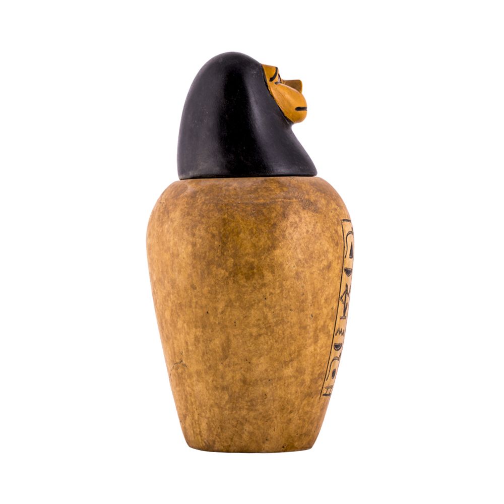 The ancient Egyptians used canopic jars to hold and preserve their owner's viscera for life during the mummification process. The lid is normally the God guarding the human inside. This exquisite piece of basalt stones was crafted by our Egyptian craftsmen.