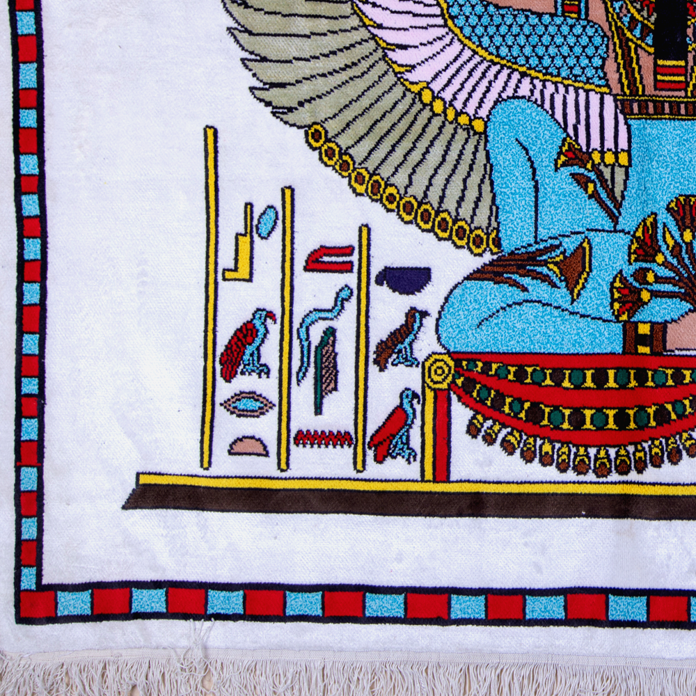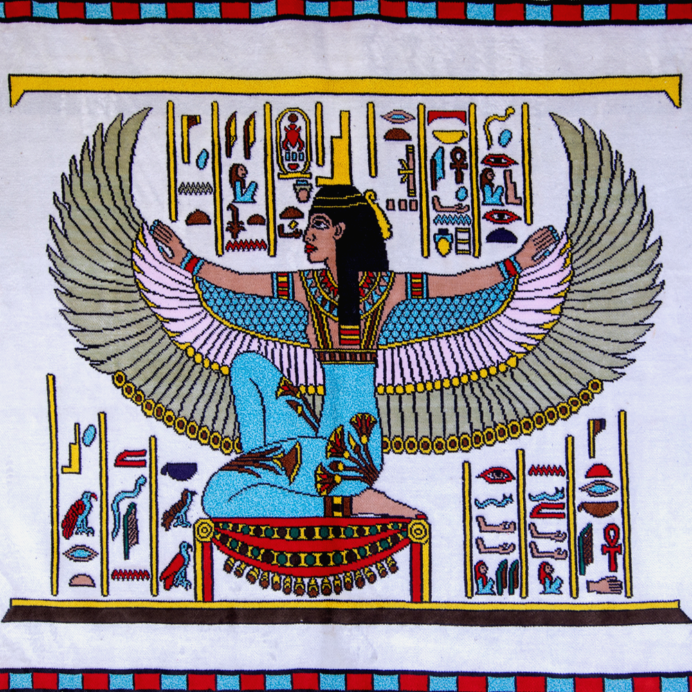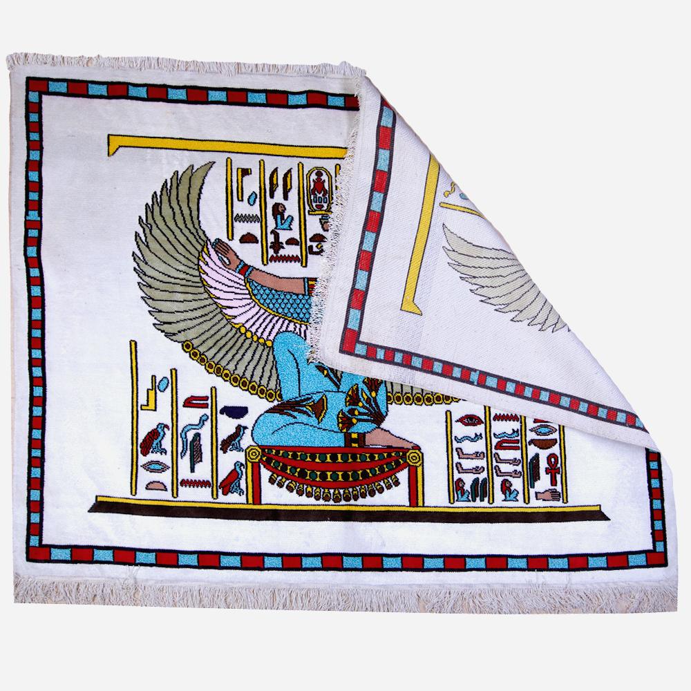 After knowing about this wowing process to make a rug in a very luxurious and royal technique, let us explain the design on the rug. The design is of ancient Egyptian history, Goddess Isis while spreading her wings while spearing her wings in a protection scene that was mainly found in the Tomb of Pharaoh Seti I in the Valley of the Kings. Isis is Goddess of motherhood, magic, fertility, and rebirth. She was regarded as the “Eye of Ra” and was worshipped as the “Great of Magic”. She had a great love for her husband and brother Osiris, whom she brought back from the dead. By a skillful magician, she gave Osiris breath by flapping her wings above him while she transformed into a bird. She also had protected her son Horus from snakes, predators and other dangers; thus, she would protect mortal children as well. The portrait was used in the tomb to spear protection and safety against any bad soul.
