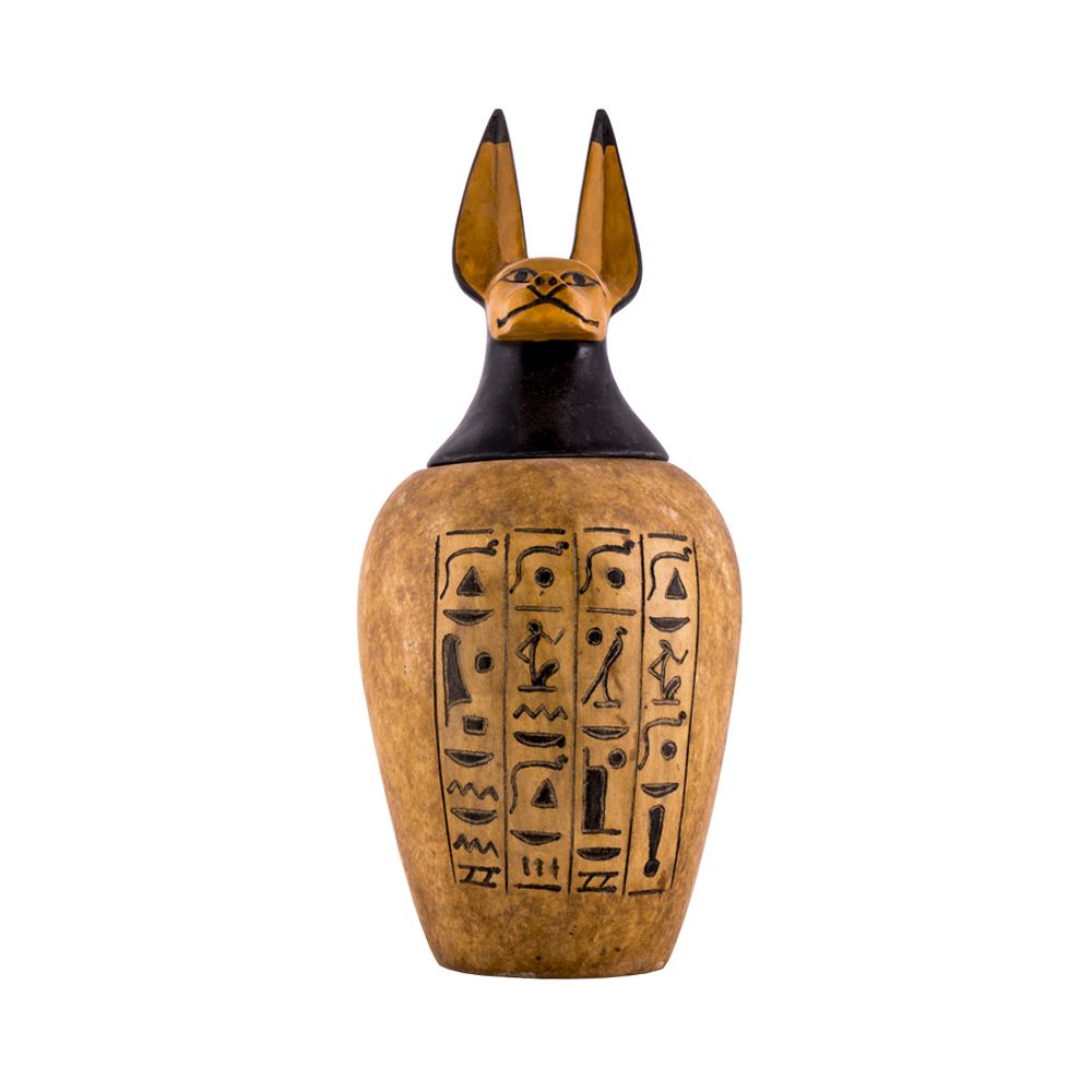 Canopic jars were used by the ancient Egyptians during the mummification process to store and preserve the viscera of their owner for the afterlife. The lid usually represents God protecting the person stored inside. Our Egyptian craftsmen created this beautiful piece from basalt stones.