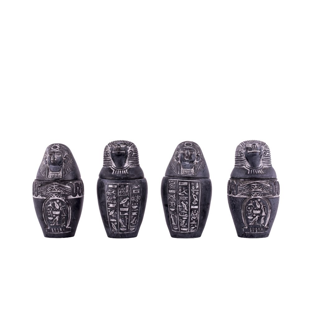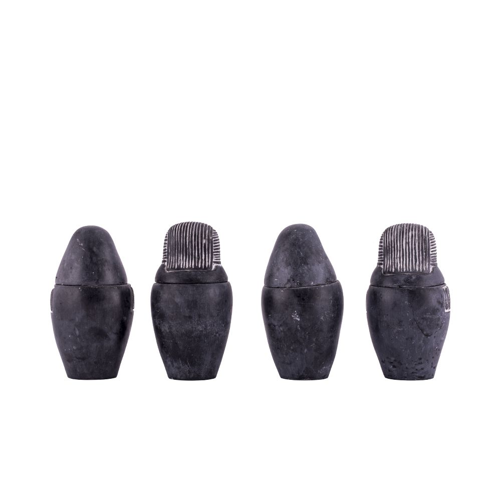 A set of the four Canopic Jars hand-carved from Basalt Stones and painted in vivid black.
