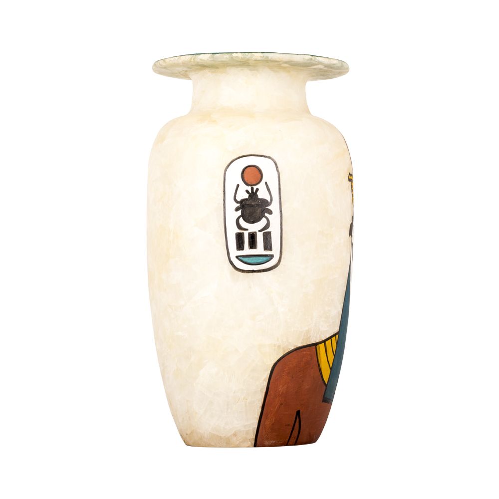 Horus Vase, a genuine Egyptian home décor, is a vase hand-curved from white alabaster stones. It is fully handmade by our talented and creative craftsmen located in Upper Egypt. Horus, the Falcon-headed god figure is painted by vivid and lasting colors. The vase is a unique touch to be added to your room or your office décor. It gathers between the creative and beauty of creation along with the valuable motifs of Ancient Egypt. Horus was believed to be the Ancient Egyptian of Sky and Heavens. He was also the divine son of both Isis and Osiris.