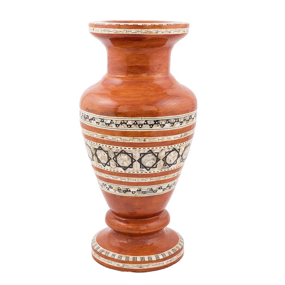 Deluxe Islamic Rustic Wood vase is handcrafted with our talented and professional artists who cleverly deliver that same royal spirit of Islamic culture through their work. The vase is crafted from Mahogany wood of master quality that is featured for its hardness, and its ability to bear any kind of pressure. Then the Vase is hand inlaid with real precious mother-of-pearl with colorful and shiny effect. The whole coverage of the vase is made with Carrot glass paint. Arabesque designed pattern that is made from geometrical shapes formulating the beautiful sophisticated natural design.