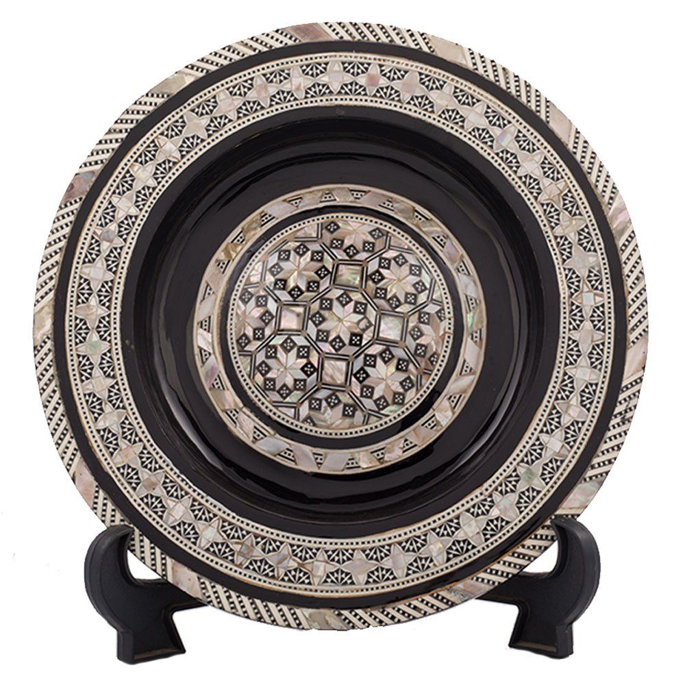 Luxurious Arabesque antique plate is hand-crafted with mahogany wood that is well-known for it's master quality hardwood. The plat is shaped and hand-inlaid with our talented artists and craftsmen with precious rare mother of pearls. It is a totally natural material mainly extracted from molluscan shells and made up from the outer coating of pearls. The Nacre tesserae are cut into small pieces with different shapes, and then the shapes are painted with natural colors. The pearls are inlaid in the shape of the royal Islamic arabesque art style that identifies Islamic culture and civilization. Islamic artists were using their innovation to imitate the beautiful elements of Nature through geometrical obstruct patterns on their furniture. The plat is glass paint with brown color that almost fits with most of the furniture items. A very special piece of decoration is with a royal simple design to add inherited beauty to your room.