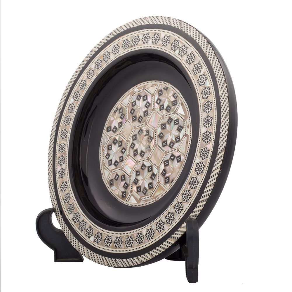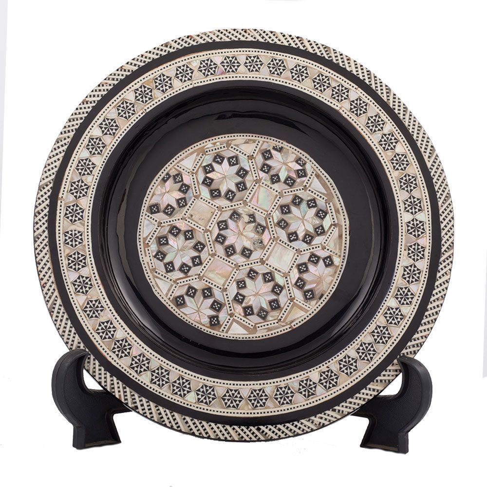 Luxurious Islamic designed Decorative Plate for sale is hand-crafted with mahogany wood that is well-known for its master quality hard wood. The plat is shaped and hand-inlaid with our talented artists and craftsmen with precious rare mother of pearls. It is totally natural material mainly extracted from molluscan shells, and made up from the outer coating of pearls. The Nacre tesserae are cut into small pieces with different shapes, and then the shapes are painted with natural colors. The pearls are inlaid in the shape of the royal Islamic arabesque art style that identifies Islamic culture and civilization. Islamic artists were using their innovation to imitate the beautiful elements of Nature through geometrical obstruct patterns on their furniture. The plat is glass paint with brown color that almost fits with most furniture items. Very special piece of decoration is with royal simple design to add inherited beauty to your room.