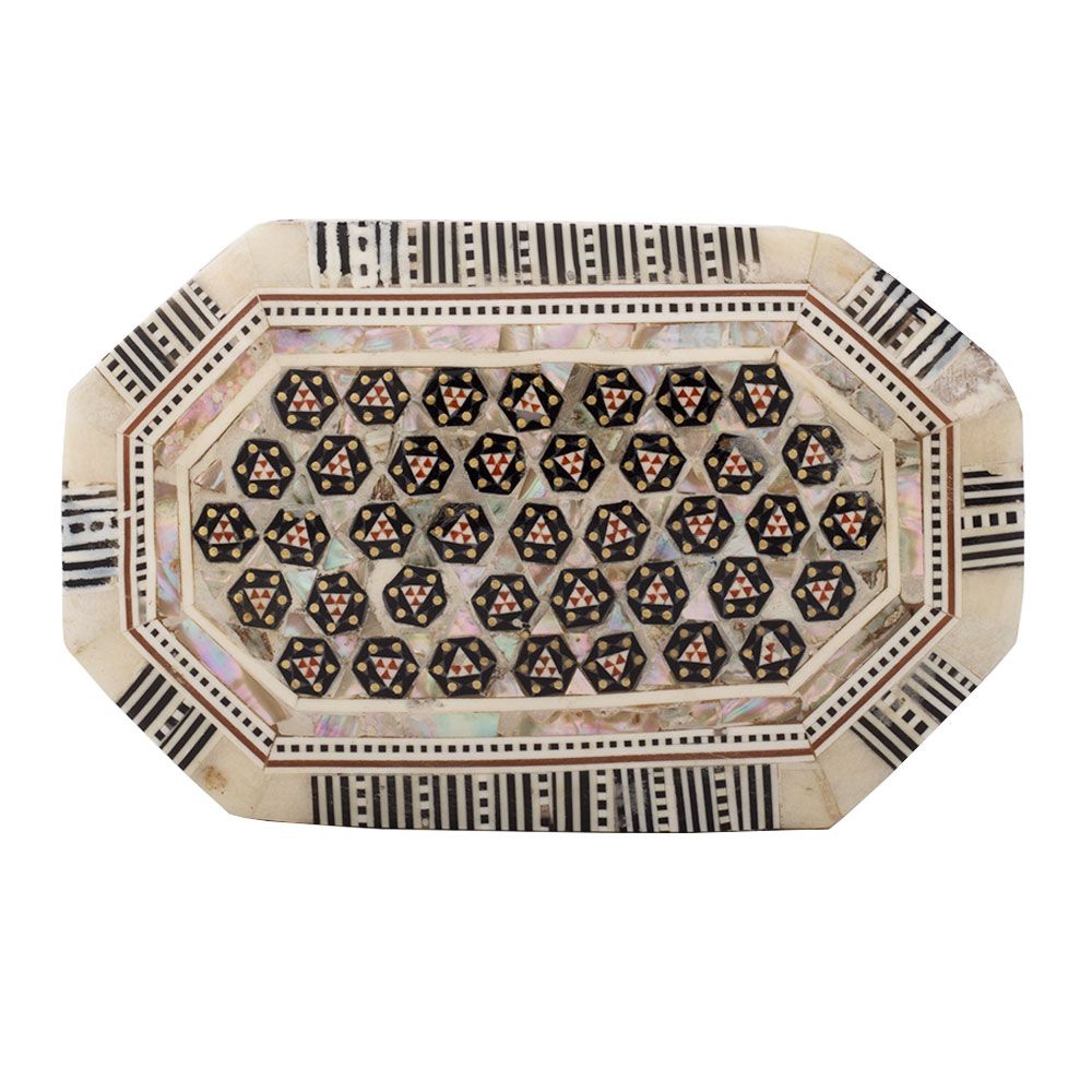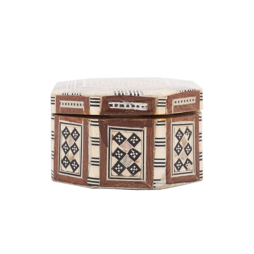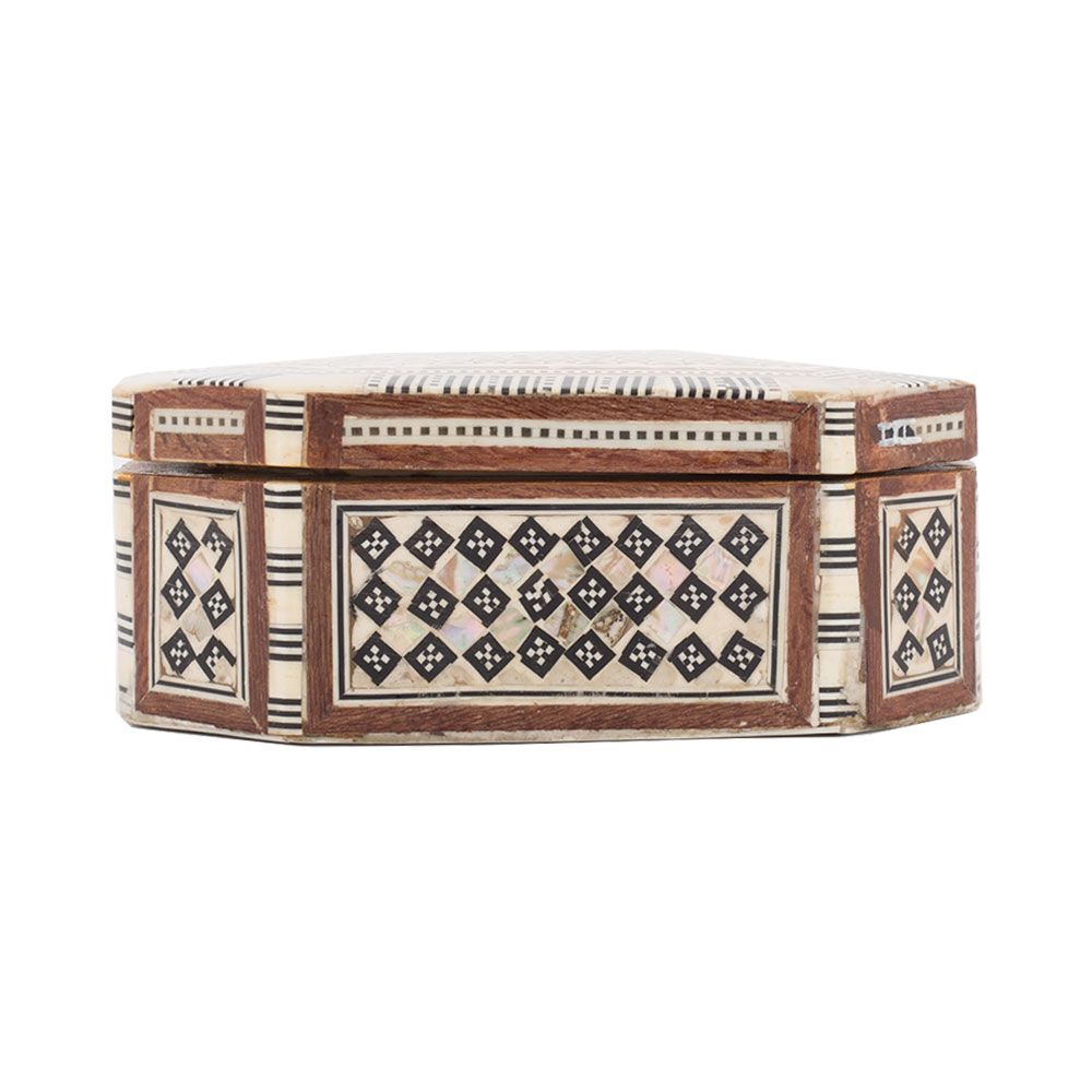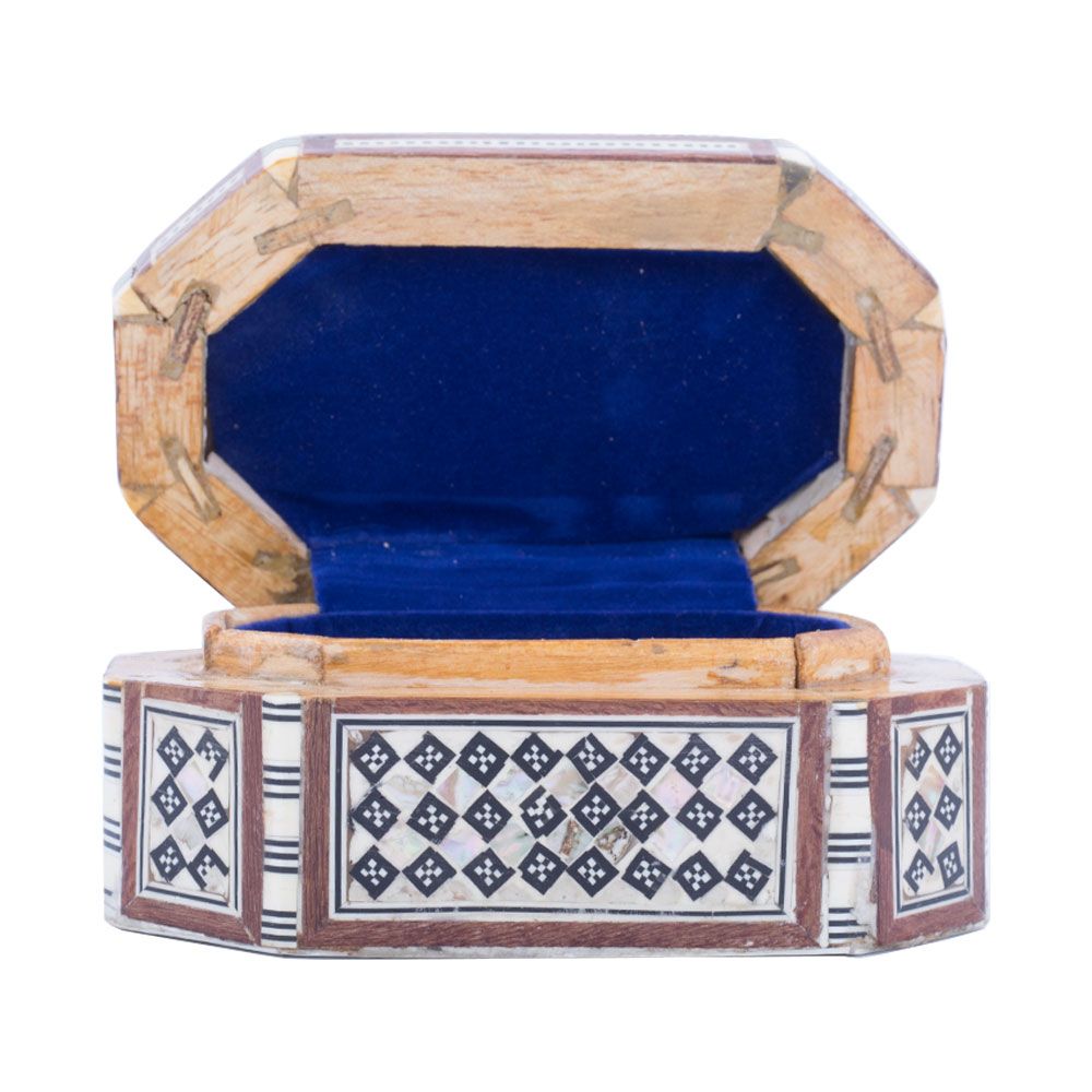Deluxe Islamic Antique Wooden Jewelry box is hand-made with Master quality mahogany wood that is well known for its strength, beautiful colors and smooth structure and surface. Then the box is hand-inlaid with rare precious mother-of-pearl. Our mother-of-pearl is real colorful and shiny in comparison with other mother-of-pearl in the market. The edges of box are painted with glass brown paint that almost fits with most of the furniture. Arabesque art style decorated box with the royal and cultural technique of Islamic art, the mother-of-pearl pieces are trimmed in small geometrical shapes and inlaid in floral patterns. Arabesque style is featured for imitating the natural elements on the stuff such as furniture in obstructs. Islamic artists used their innovation to decorate furniture in this nice and clever way reflecting their own beliefs through their art. The box is a real special piece for keeping your most precious items inside, either jewelries or other. It can also fit as a piece of decoration that beautifies your room.
