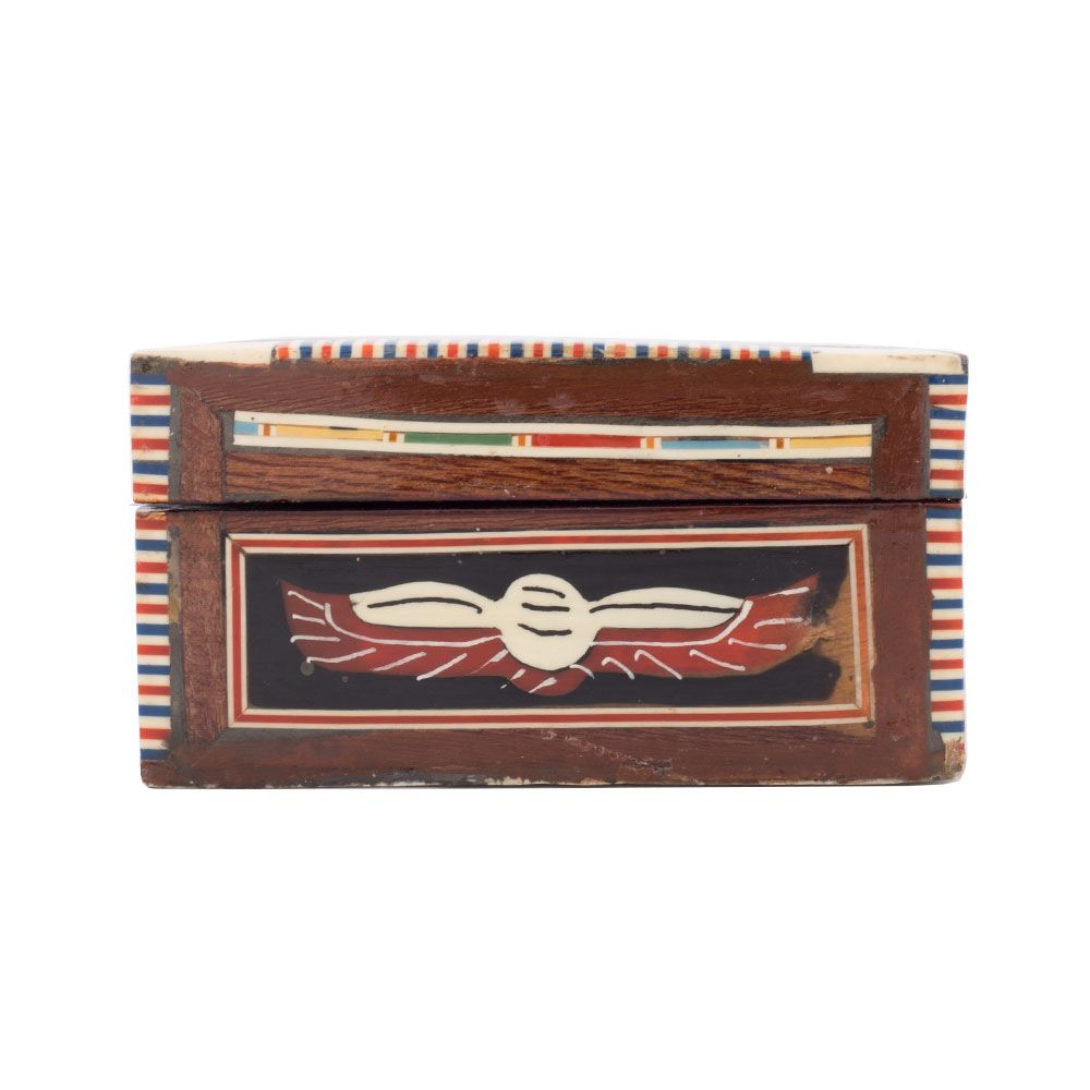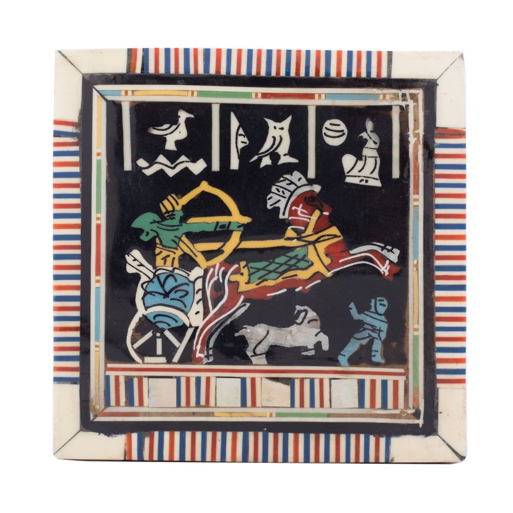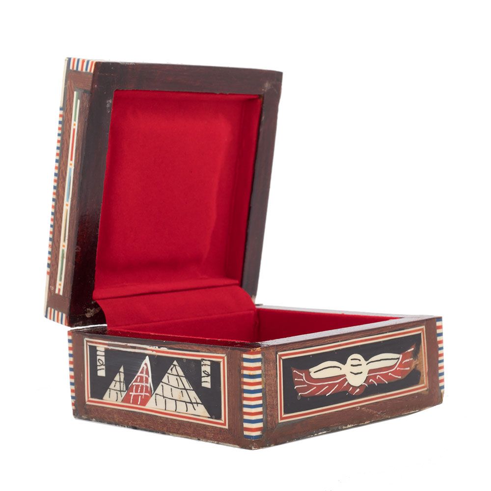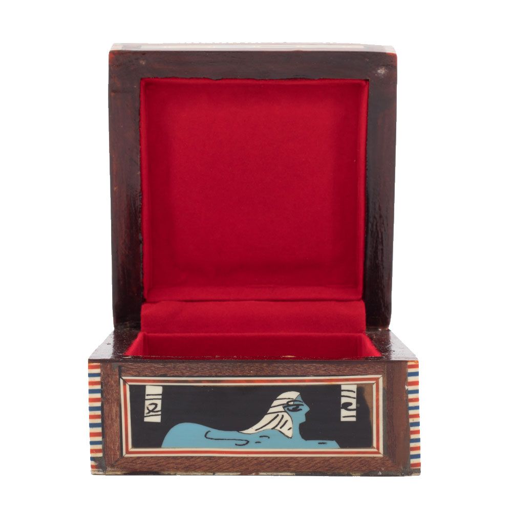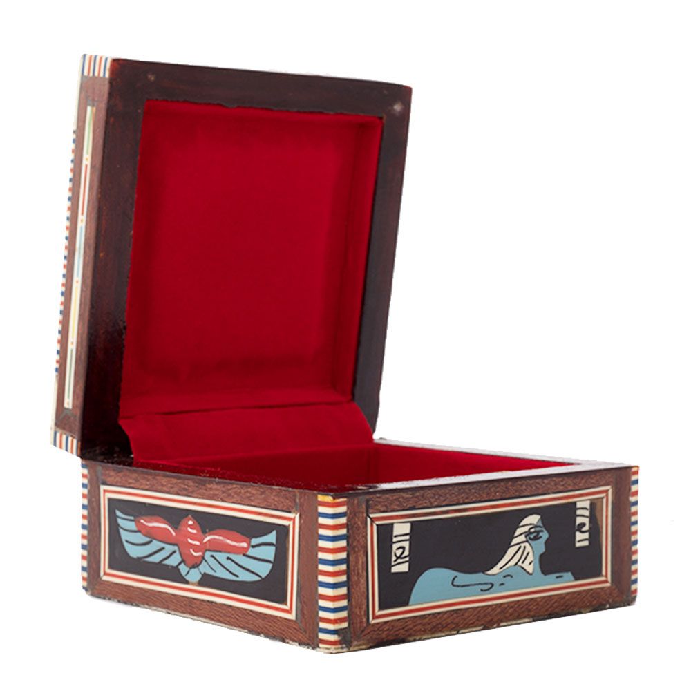 The pharaonic jewelry box for sale is hand-crafted with master quality Mahogany wood that is featured by its hardness and its ability to bear any pressure. The box is inlaid with precious rare Mother of Pearl that is painted with natural colors. Rectangle box is decorated with Pharaonic scene of King Ramesses II while he is heading to Kadesh war. It was a major battle between the Egyptians under Ramses II and the Hittites under Muwatallis, in Syria, southwest of Ḥimṣ, on the Orontes River. Ramses II achieved a great victory over Muwatallis. However, it is remarked in the history as the first peace treaty in Ancient history. As a result of that treaty, the Hittites and Egyptians then entered into a new relationship with each other through which they shared their knowledge and experience. A vintage piece of Decoration, you can use it as a jewelry box for keeping your most precious pieces or as a piece of decoration in your room or office.