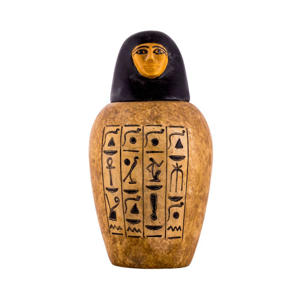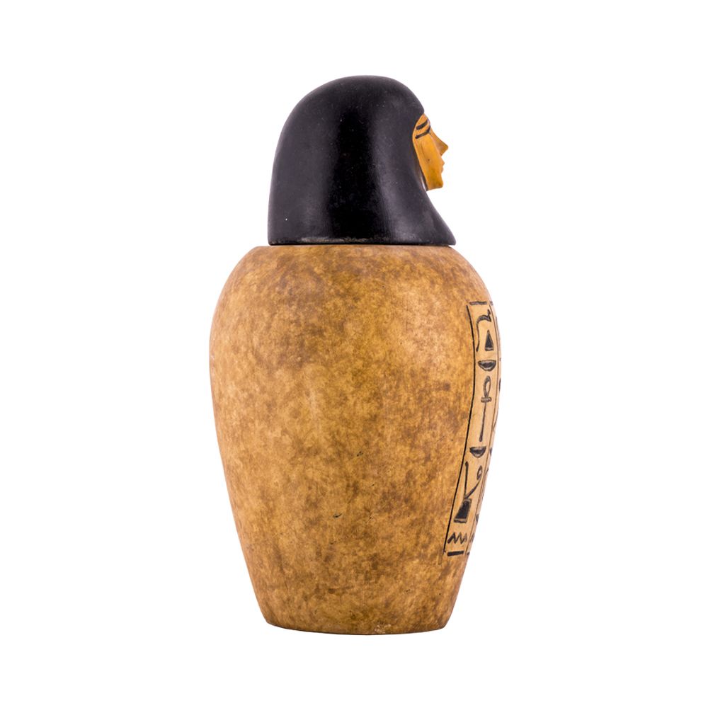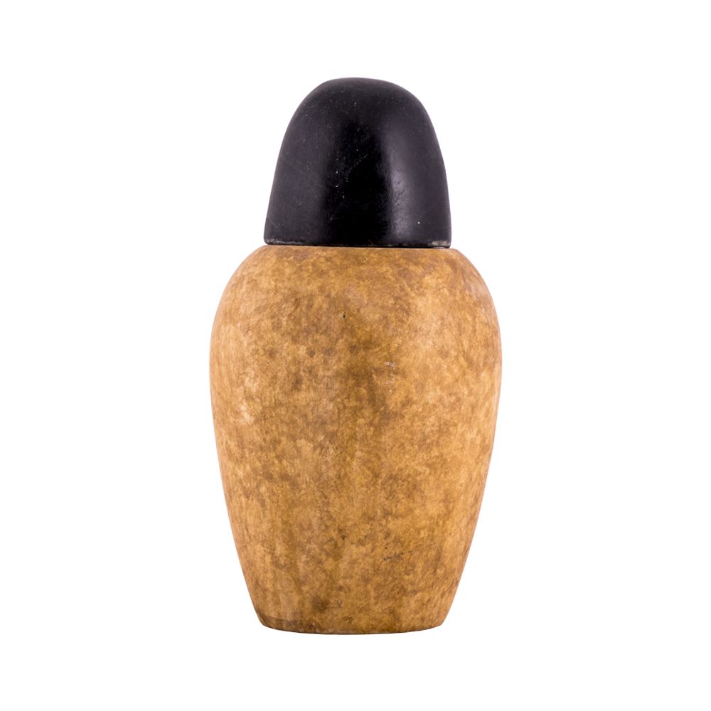 In ancient Egypt canopic jars were used in the process of mummification to carry and preserve the viscera of their owner. Normally, the Lid is the God looks out for the human till the resurrection. Our Egyptian craftsmen made this exquisite basalt art piece.