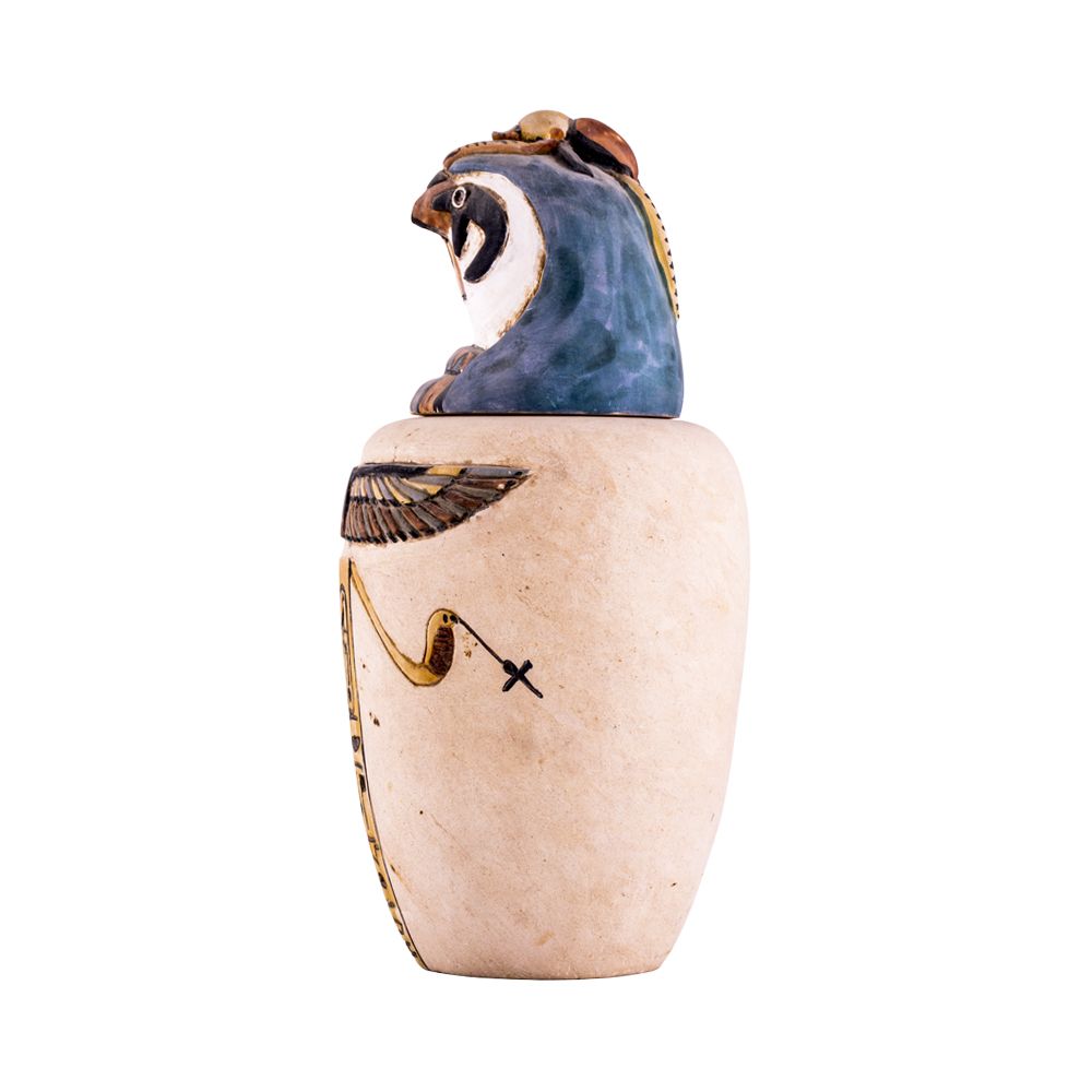 Horus-Headed Egyptian Canopic Jar for sale is hand-curved from Basalt stones and finished with vivid paint. The jar is purely made by Egyptian small families located in Luxor. The accurate curved details of the figure show the professionalism of the craftsmen. A unique piece of décor adds to your home giving an instant atmosphere of the ancient Egyptian civilization. It sizes around 28 H, 14 W cm (11” H, 5.5” inch).