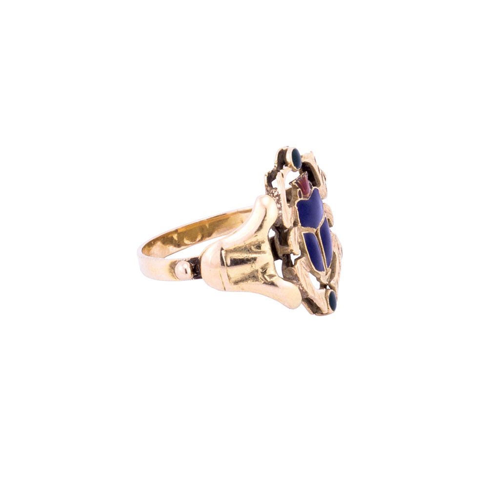 The beauty of the ring emerges through the ancient Egyptian motif of the scarab. The scarab in Ancient Egyptian myth was popular amulet which represented Art. Scarabs for ancient historians were the source of information and knowledge. The Scarabs were firstly appeared in The Middle Kingdom (2055-1650 BC), they were used as seals. Scarabs had many purposes and significance through ancient Egyptian history, it was used as a symbol of wealth, and it was also used as a fashionable accessory having artistic expression.