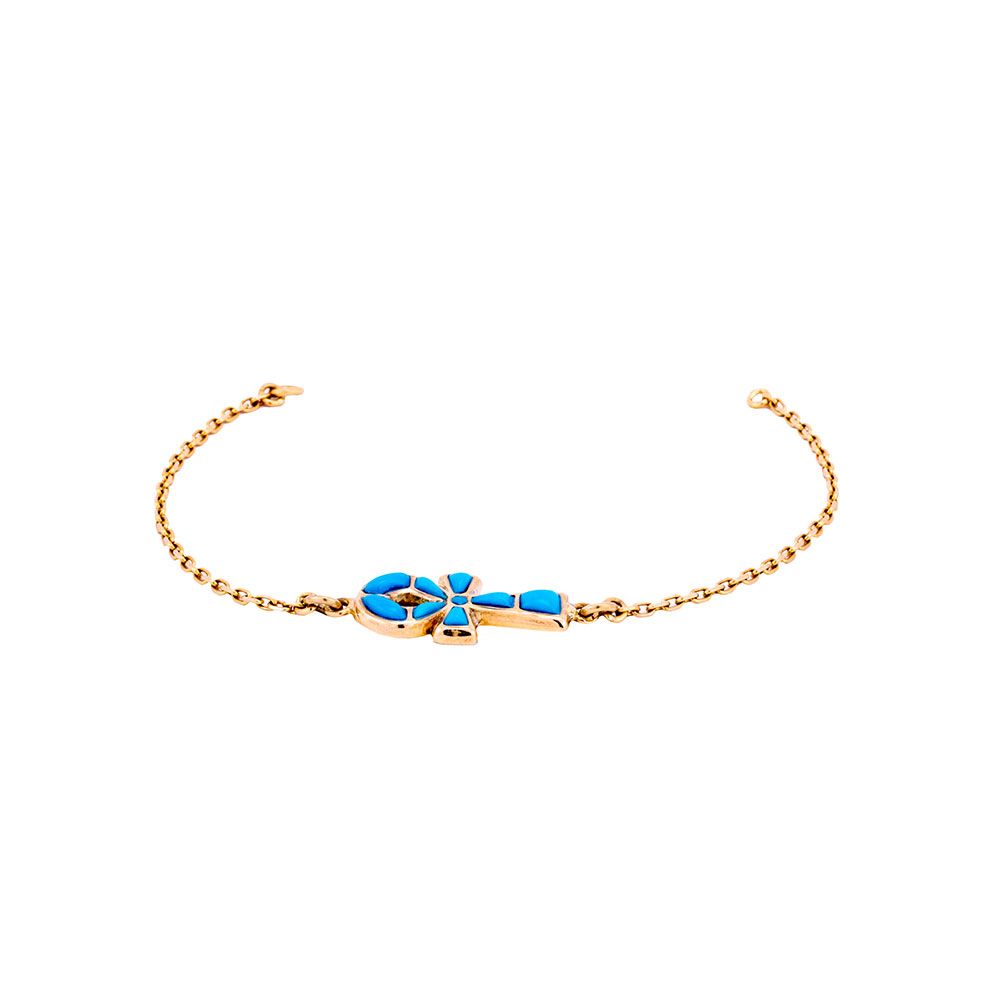 Gold Ankh Bracelet is designed in the Ancient Egyptian Ankh (Key of Life). The Bracelet is handmade of 18k Gold and inlaid with Semi-precious Turquoise stone. A piece of jewelry that is featured by the uniqueness of design, gathering between the beauty of trendy style and the historical symbolism. The Ankh had a major role to play in Ancient Egyptian Culture. It signified wisdom and Justice. As shown in most of the Ancient Egyptian Drawings on their temples' walls, the ankh was held by the Gods and Goddesses. Gold chain bracelet handmade by Egyptian Hands with a huge deal pf accuracy. It is designed as a chain bracelet to be easily adjusted according to your hand size. Get your bracelet now and experience a different elegance type of fashion.