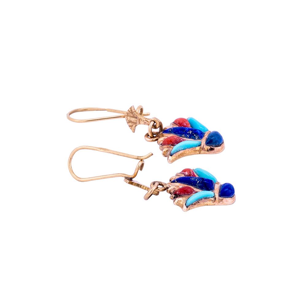 Beautiful shiny and trendy lotus earring gold is made of pure master quality 18K gold. The earring is hand-crafted by our talented and professional craftsmen who are located at the heart of Cairo. The design of the earring is firstly made on rough paper, and then it is curved and trimmed for perfect equal edged surface. Finally, the earring is hand-inlaid with a seim-precious gemstone of turquoise, lips, and coral. The earring is made in length of around 5 cm for a more elegant and luxurious look. It weighs around 4.15 GM.