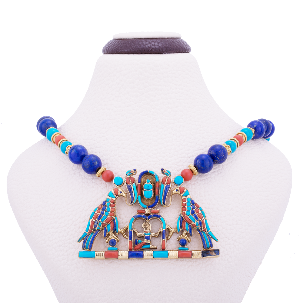 Handmade Gemstone Necklace is hand engraved with precious stones of lapis, Coral, and Turquoise. A fashionable piece of jewelry is engraved by talented Egyptian hands with the same technique and style of ancient Egyptian craftsmen. The necklace is made in the shape of the falcon-God Horus. He is well-known throughout history as the god of protection and power. In other myth, he was the divine son of God Osiris and Goddess Isis. We introduce you a unique piece that is made with the utmost level of sensitivity and finesse to produce this timeless mixture of the beautiful tradition and the sophisticated elegance. Catch the eyes in any crowd wearing this piece.