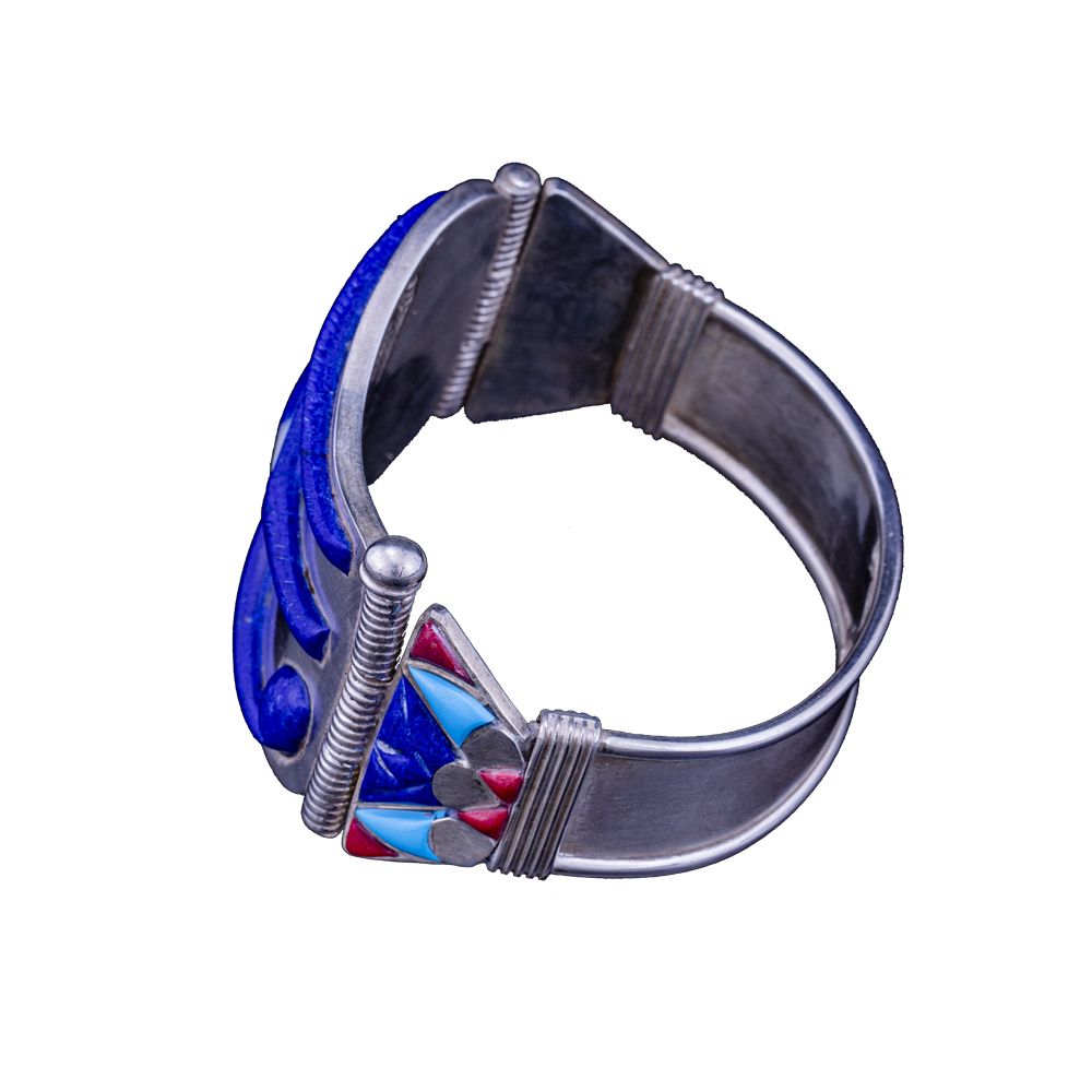 Protective Wedjat eye of Horus Bracelet is handcrafted with pure silver material by our talented and professional crafters settled in the heart of the Cairo. The bracelet is professionally graved and crafted and then it is hand-inlaid with Semi-real gemstone of Coral, Turquoise, and Lips stones for better value and royalty. On the sides of the bracelet is a graved Lotus flower adding beautiful trendy touch to the bracelet. Fashionable bracelet with royal historical touch of ancient Egyptian symbols with trendy and modern design. Gift the bracelet now to your dearest one, you mom, your friend or your beloved. The trendy design of the bracelet makes it goes with everyday outfit or in an important event. The size of the bracelet is customized according to your hand size.