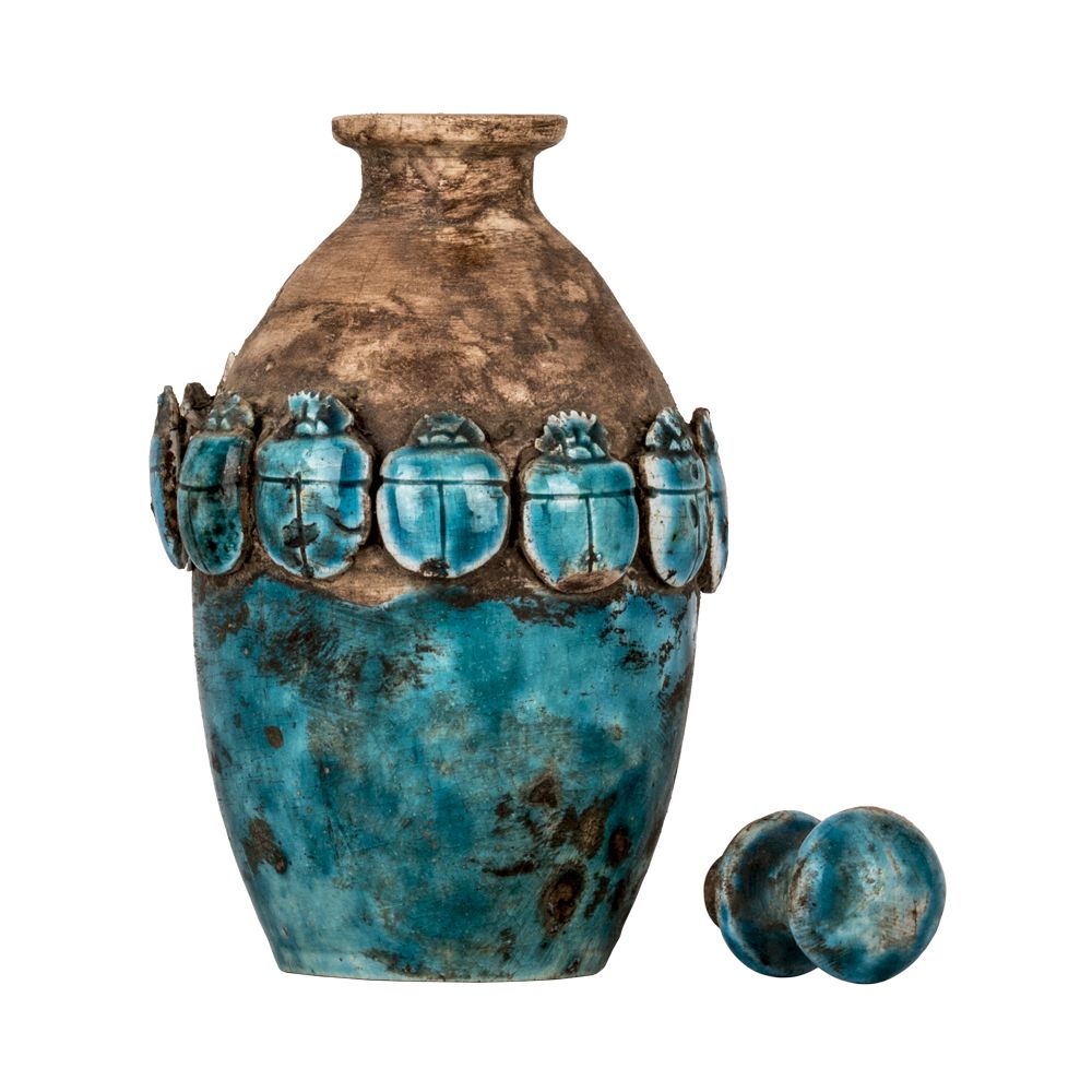 Decorative Essential Oil diffuser is hand-curved from Limestone and covered with turquoise paint. It is adorned with the Great Scarab of Ancient Egypt. The symbol of Wealth and fashion was used by the Ancient Egyptian people as a currency and a fashion ornament. Add a unique piece to your room with this essential oil diffuser sized in around 15 H 7 W 4 L cm (6” H, 2.5” W, 1.5” L inches). Shop it now and enjoy door to door shipping.