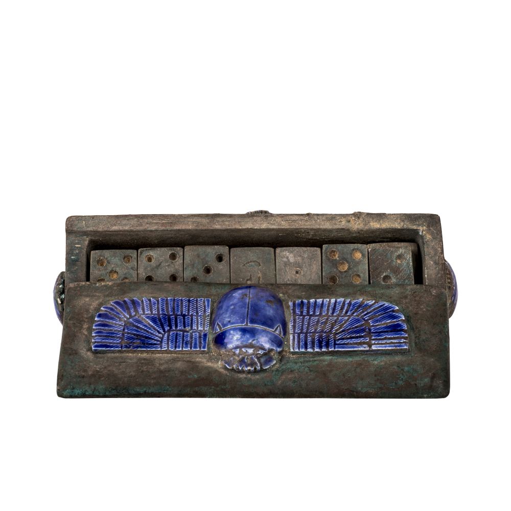 • Full set of Domino pieces, 28 Pieces, with a vintage box adorned with the winged scarab and a slider lid.