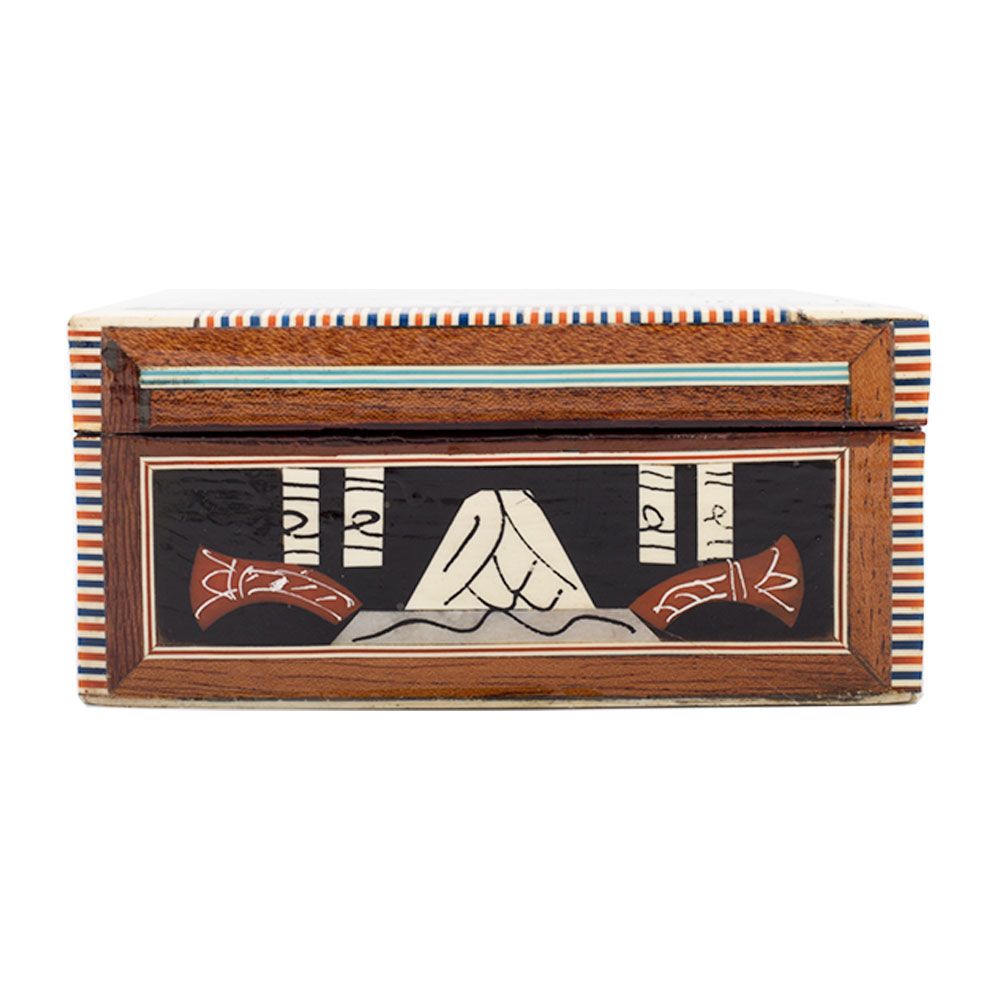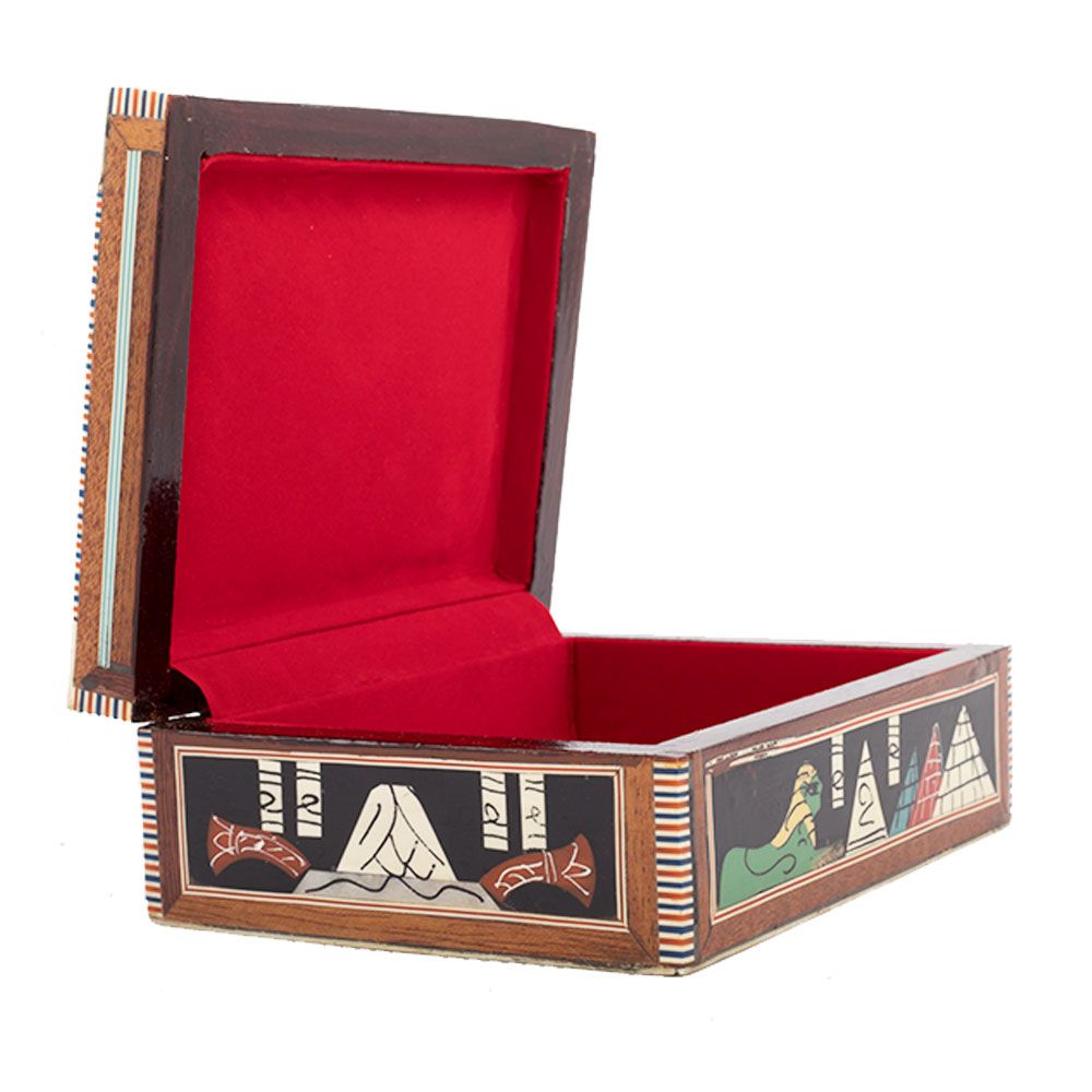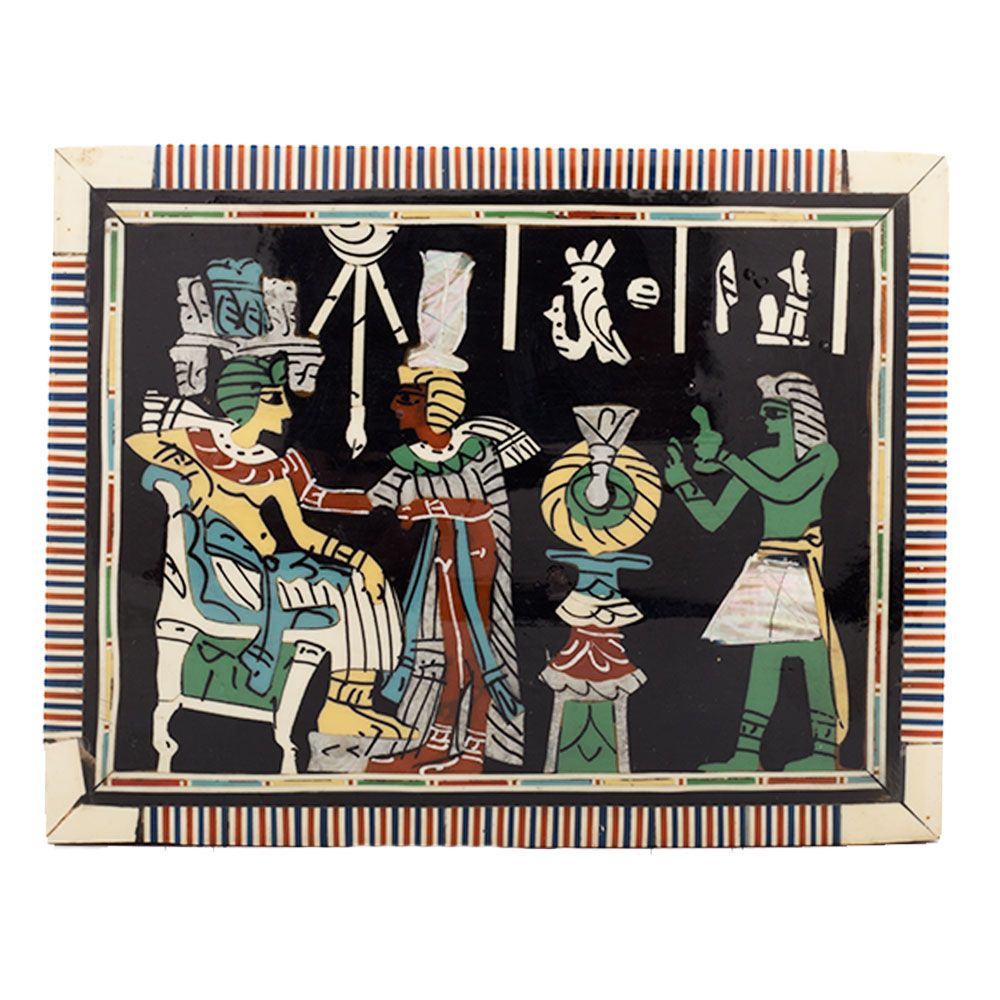 The pharaonic box is hand-crafted with master quality Mahogany wood that is featured by its hardness and its ability to bear any pressure. The box is inlaid with precious rare Mother of Pearl that is painted with natural colors. Rectangle box is decorated with a Pharaonic scene of the love story between King Tut with his wife. The young Tutankhamun sits in a relaxed pose, while his wife Ankhesenamun rubs her husband's shoulder with fragrance oils under the light and the warmth of the sun blessings from the god of the sun, Ra. It refers to the love and unity between the king and the queen. A vintage piece of Decoration, you can use it as a jewelry box for keeping your most precious pieces or as a piece of decoration in your room or office.