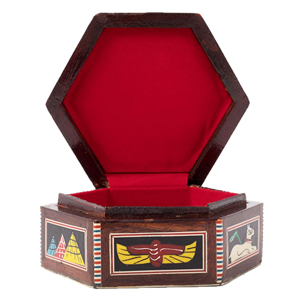 Pharaonic box is hand-crafted with master quality Mahogany wood that is featured by its hardness and its ability to bear any pressure. The box is inlaid with precious rare Mother of Pearl that is painted with natural colors. Hexagonal box is decorated with Pharaonic scene of two Ancient Egyptian Queens doing prayers while their kids sit in front of them. The scene is decorated with hieroglyphic letters and lotus flowers which represented peace and love in Ancient Egyptian Myth. Vintage piece of Decoration, you can use it as jewelry box for keeping your most precious pieces or as a piece of decoration in your room or office.