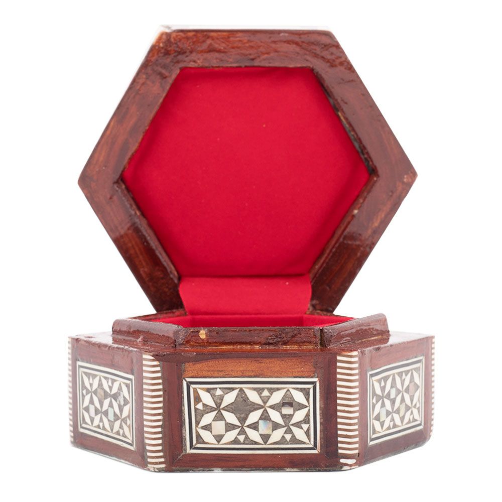 Deluxe Islamic unique jewelry box is hand-made with Master quality mahogany wood that is well known for its strength, beautiful colors and smooth structure and surface. The box is made into hexagonal shape with artistic ornaments of Arabesque art style. It is hand-inlaid with rare precious mother-of-pearl. Our talented artists only work with full natural materials to reflect the value and the uniqueness of the handcrafted pieces. The mother-of-pearl is mainly extracted from molluscan shells and made up from the outer coating of pearls. The Nacre tesserae are cut into small pieces with different shapes, and then the shapes are painted with natural colors.