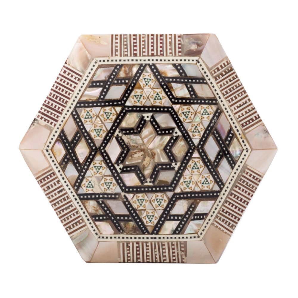 The pearls are inlaid in Geometrical floral patterns that are known as an arabesque art style. Arabesque art style emerged in Arab countries between them Egypt, Egyptian artists were using their innovation and the inspiration from the surrounding nature. They used to depict Nature elements on Furniture and other stuff in geometrical shapes and patterns of circles, triangles, and squares to formulate floral or starts patterns in a very nice obstruct way.