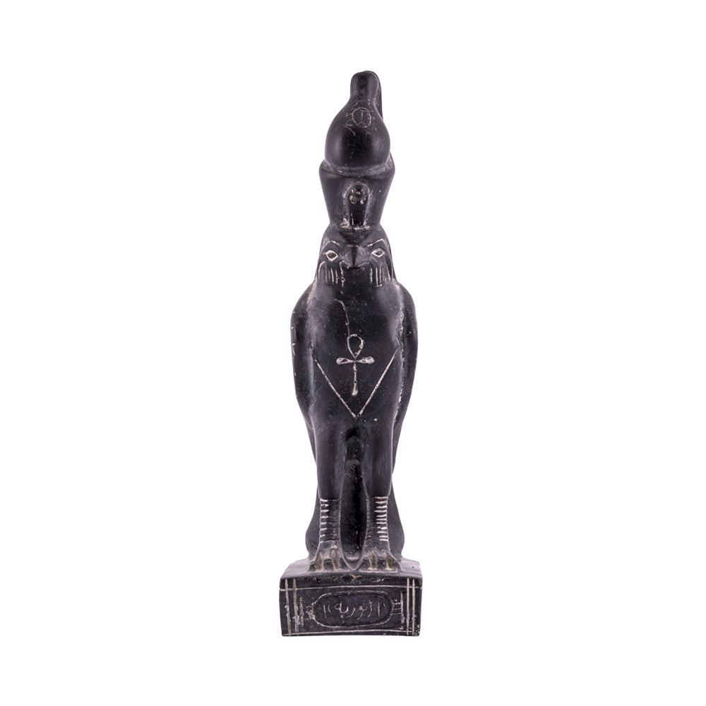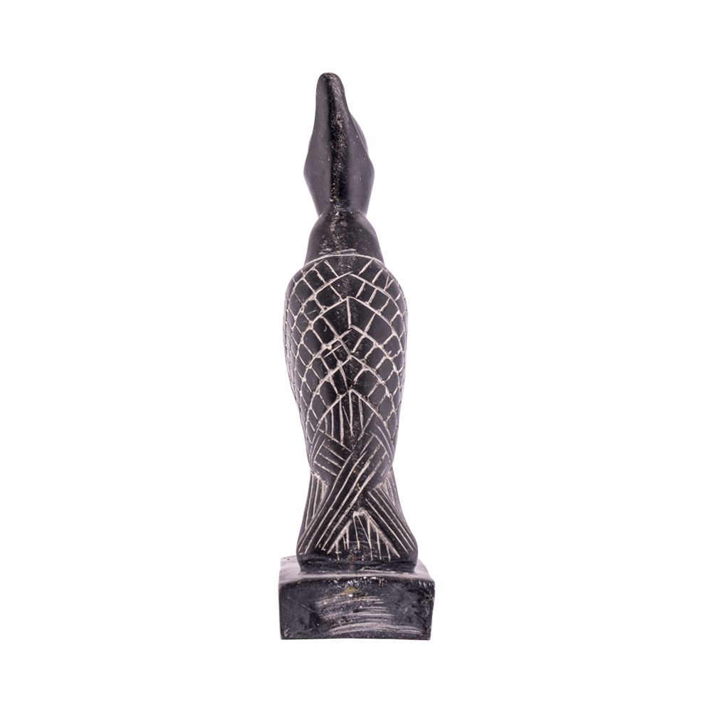 The Horus God of Sky Falcon Bird Statue is handmade of Basalt Stones and painted with black gloss paint.