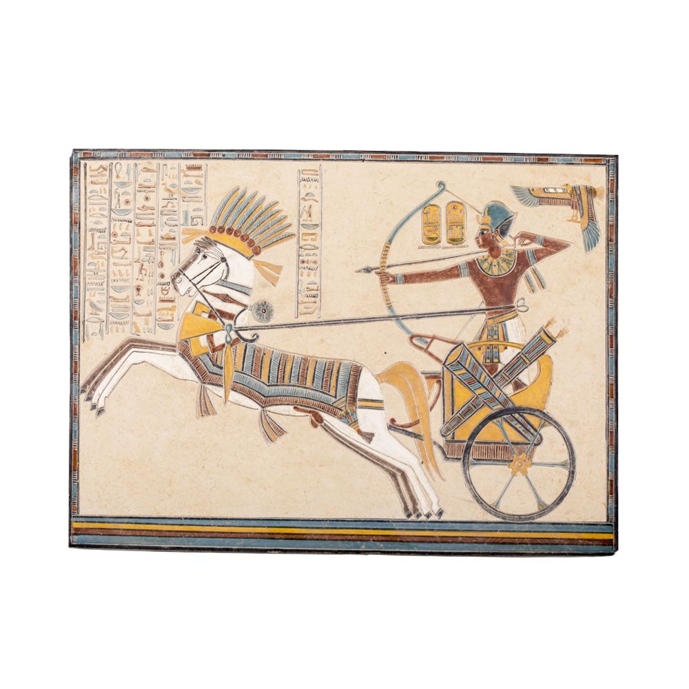 Egyptian Wall Décor of King Ramses Portrait hand curved from white Limestone. The Curves of the portrait are hand-painted with lasting paint by our talented artisans located in the Upper of Egypt. A masterpiece shows the famous scene of King Ramses while his Kadesh war against the Hittite Empire. During the Battle of Kadesh, the Egyptians were for the first time using the chariot during the war.