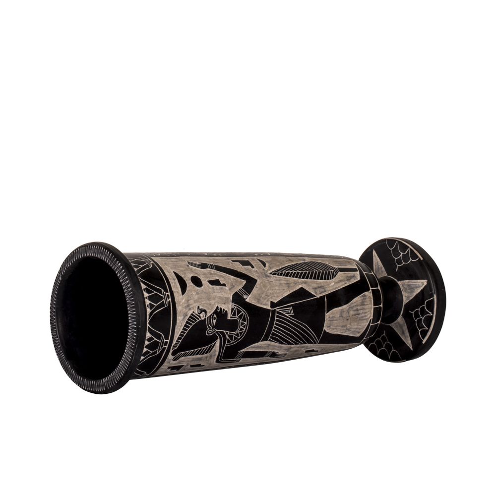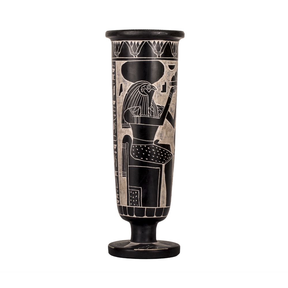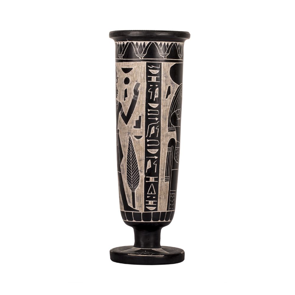 Handmade Egyptian vases for sale are ornamented of Ancient Egyptian most notable figures. The Vase is hand-crafted of Black basalt stone. Basalt stone is known for its strength and high quality in crafting luxurious antiques. The vase is featured with the ornaments of both Osiris God on one side and God Horus on the other side. Both are the most notable gods in the Ancient Egyptian History. Osiris is the first god in the ancient Egyptian history. Horus is the divine God of the sky and the son of God Osiris and Goddess Isis. The Vase is fully handmade and ornamented by Talented Egyptian artists in Upper Egypt. It sizes around 33 H, 10 W, 12 L centimeters (13” H, 4” W, 4.5” L inches). Own your vase now and add a vintage touch with the ancient Egyptian history flavor to your décor.