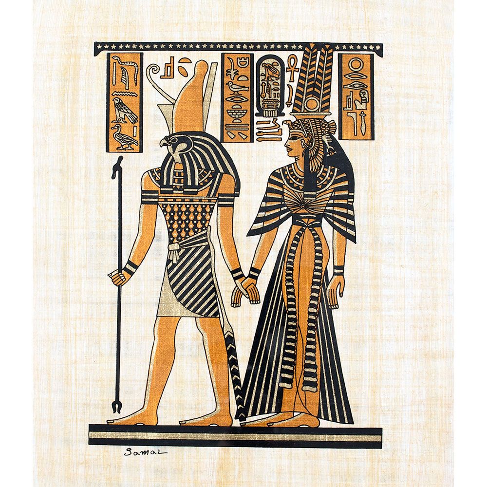 An Egyptian handmade Papyrus depicts the image of goddess Maat and Horus holding each other's hands as a symbol of unity of justice and protection. The image is decorated with Hydrographical letters, the symbol of Egyptian literature.