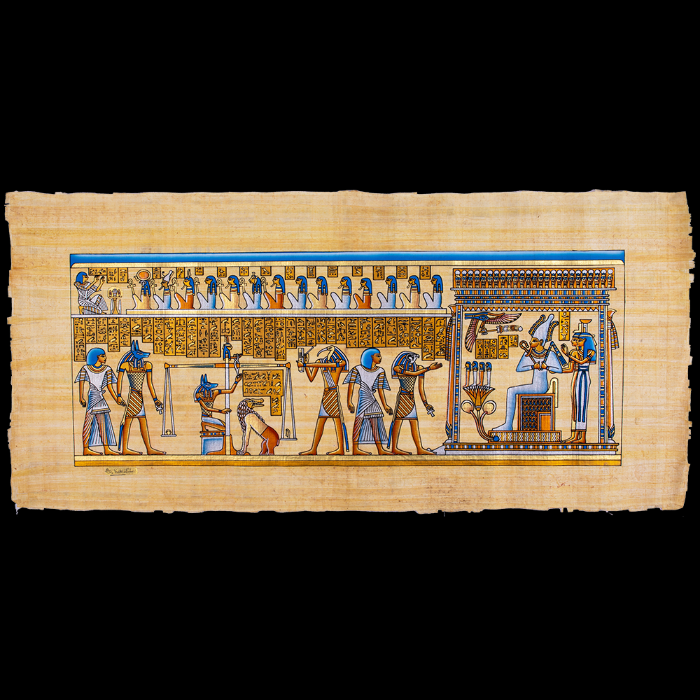 A rare judgment scene at the court of Osiris, royal Egyptian Papyrus, Bright color, fully handmade, 100x50 cm, a special Hieroglyphic alphabet Decoration.