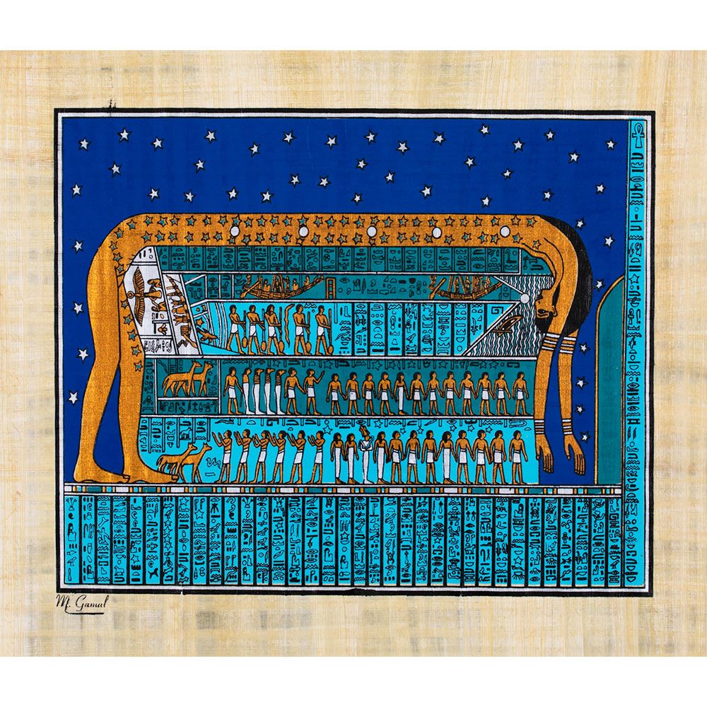 A portrait of the night journey of Ra is printed on an original handmade Egyptian Papyrus. It shows the journey of Ra bringing night and morning to the earth. Ra is the god of the sun, as believed in Ancient Egypt earth was flat covered by Ra who was the source of the sun.