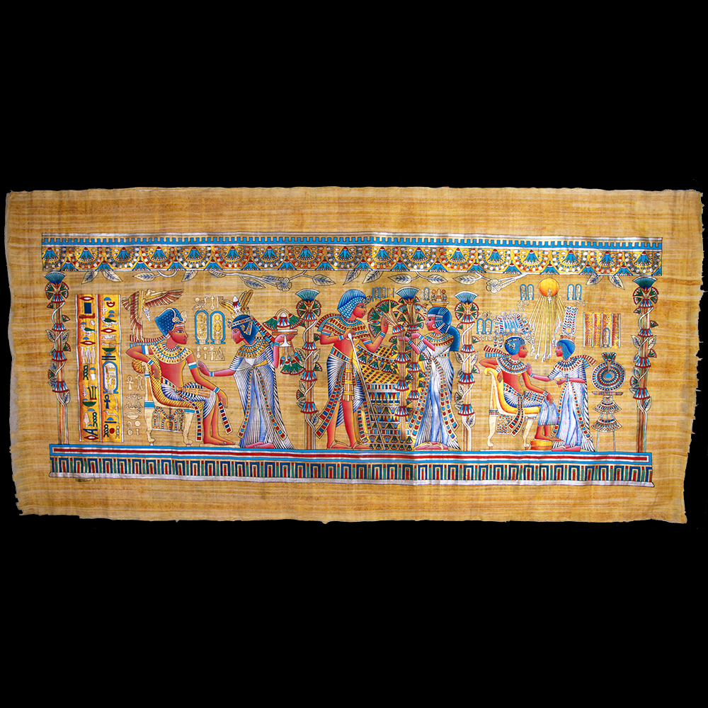 King Tutankhamen’s marriage ceremony, handmade papyrus of High Quality, Royal dark colored Papyrus, Large size of 100x200 cm, a unique decoration piece can also be used as a souvenir.