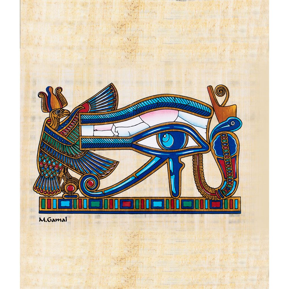 A handmade portrait of Egyptian papyrus presents the wedjat (one eye) of God Horus, the God of sun. Horus was represented as a falcon whose right eye was the sun and left eye was the moon. He lost one eye of his during a war and it became a powerful symbol for protection, wisdom, and prosperity.