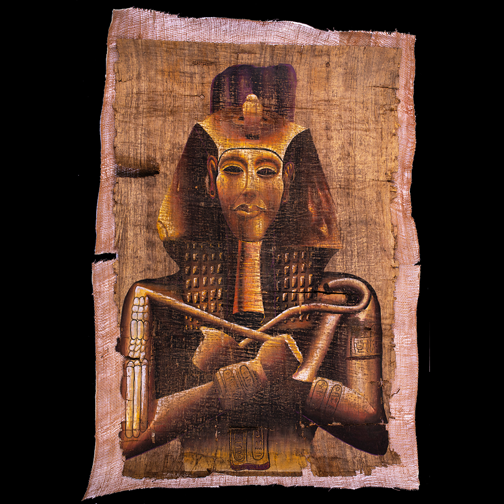 Unique handmade papyrus with king Ramses II mask hand painting with natural gouache colors, Ramses II mask