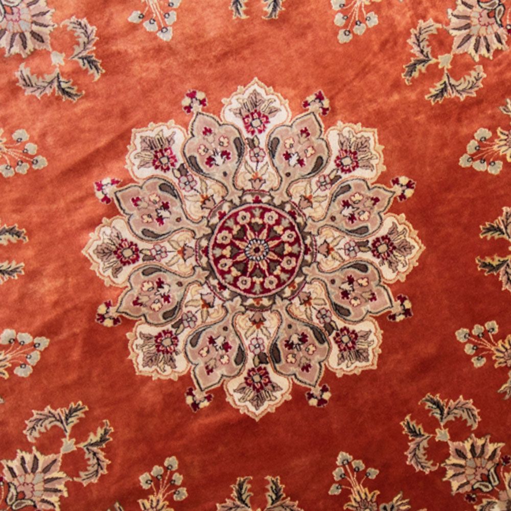 Our designers follow the same way of dividing the design as major shape and minor surrounded shapes. The central shape is a geometrical repeated pattern, forming final floral shape with accurate and sophisticated details. Then the blend of colors follows the same technique of Tekke tribe as it is made of, a major color of orange red with minor colors such as beige, off-white, Indian red, gray and olive, chocolate and black colors.