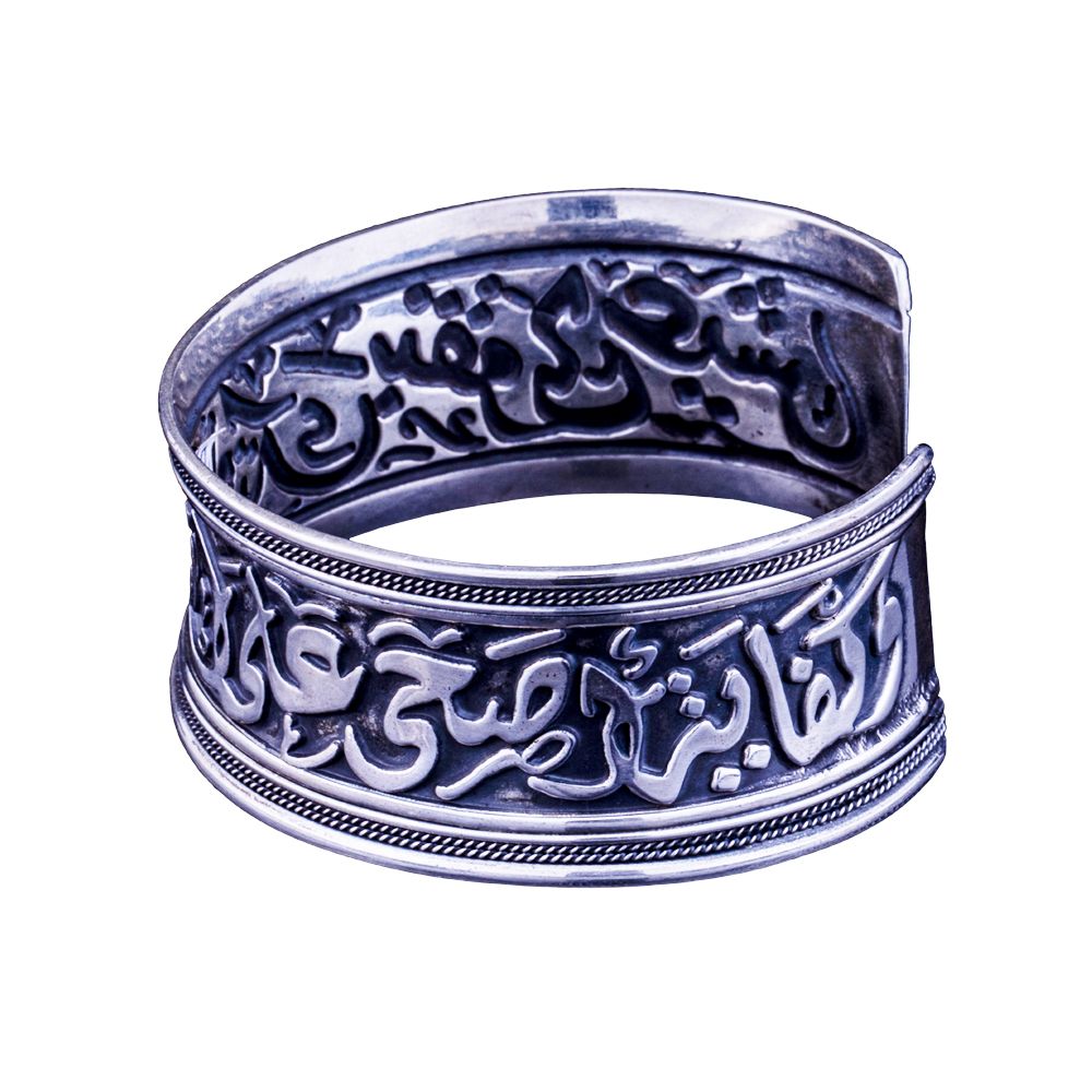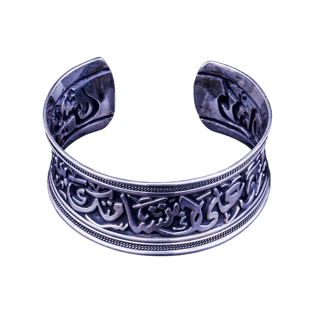 Vintage Sterling silver Arabic Calligraphy Bracelet made with the best silver materials out there. It is handmade with Egyptian talented and creative craftsmen. Adorned with Arabic Calligraphy in a popular quote. A simple of creation and accurate innovation, the ornaments are curved in a very accurate and careful method for a perfect finish. Arabic calligraphy ornaments are very royal and elegant. It is recently used in fashion decorations, dresses, scarfs, blouses…etc. If you are an Arabic Language fan or Egyptian culture Seeker so that is your perfect piece. No worry about the size as we offer you any size you want. You can customize your own size now.