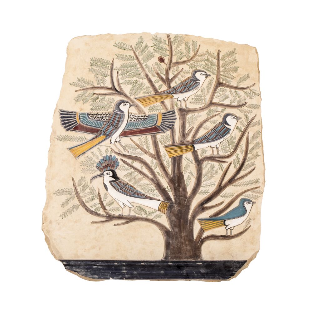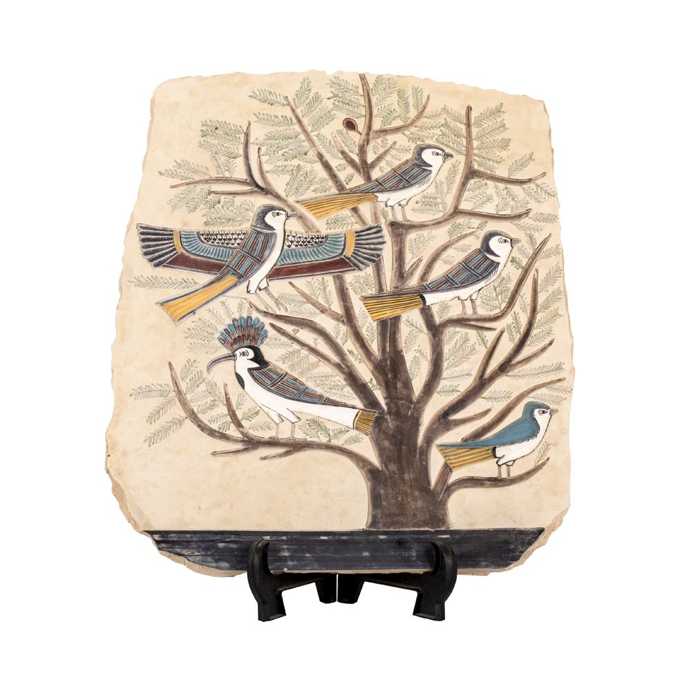 Egyptian Tree of Life portrait is handmade of white limestone. A portrait is hand-painted with shiny colors with vivid effect and lasting glory. The Portrait is the Ancient Egyptian Famous motif of the five stages of human life. Each Bird on the tree is a representation of a stage of life starting from the infancy, going through childhood, adulthood, youth and finally the maturity. It was the divine map of destiny according to the Ancient Egyptian belief. A piece of decoration adds an instance beauty of your décor. It gathers between the beauty of art and the vintage spirit of the past with the ancient Egyptian significant Motif. The piece is made of master quality limestone in an approximate size of 38 H, 32 W, 2 L centimeters (15” H, 12” W, and 0.7 L inches). Note that, Our Products are unique and handmade. Thus, a slight change in the size might apply.