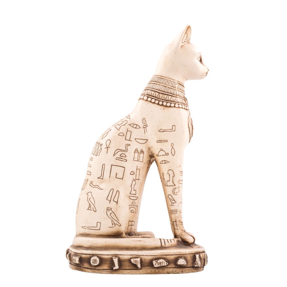 Ancient Egyptian Bastet for sale, the cat Goddess was a well-known Goddess by both men and women in ancient Egyptian myth. Bastet Goddess is the Goddess that combines the conceiving spirit, cunning, and cleverness of the cat and power and superiority of a lion. She emerged in Egyptian history in the 2nd dynasty between (c. 2890 - c. 2670). Bastet is an ancient Egyptian Goddess of Home, domesticity, women’s secrets, fertility, and childbirth. She was brought at homes to protect it from any evil spirit and diseases especially women’s disease. Bastet was believed in Egyptian myth to be the daughter of God Ra, the God of the sun, she was considered as God’s Ra Seeing Eye. On the body of Bastet are ornamented ancient Egyptian motifs of Horus protective eye, and the wealth scarab alongside with the wisdom Ankh. A vintage piece is of decoration to add a royal historical touch to your home or your hotel hall. It is hand-made by our talented and passionate craftsmen with Alabaster powder material.
