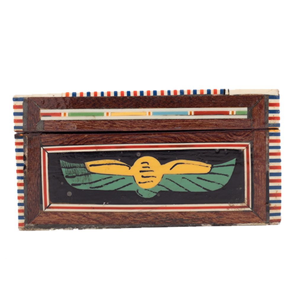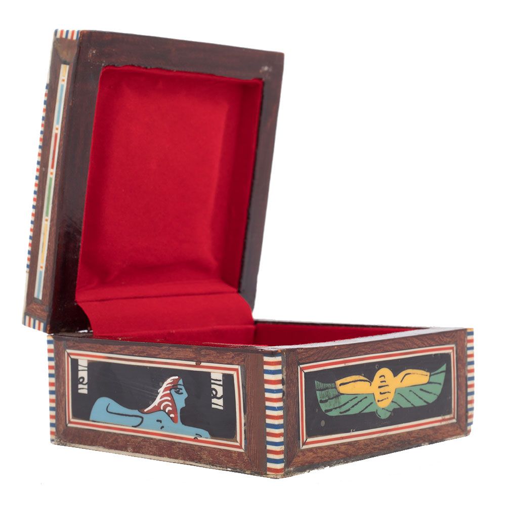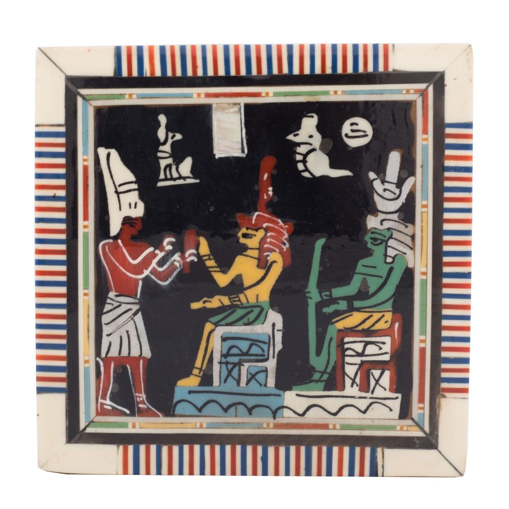 The pharaonic box is hand-crafted with master quality Mahogany wood that is featured by its hardness and its ability to bear any pressure. The box is inlaid with precious rare Mother of Pearl that is painted with natural colors. Rectangle box is decorated with Pharaonic scene of offerings are introduced by one king to both Osiris and Horus, asking for their forgiveness and blessings. God Osiris is known as the greatest god, the God of gods who were the main judger in ancient Egypt. However, Horus God is the God of protection and power. He was believed as the divine son of Isis and Osiris. Horus lost his left Eye in the war against Seth who murdered his father since then this eye has become a sign of protection. A vintage piece of Decoration, you can use it as a jewelry box for keeping your most precious pieces or as a piece of decoration in your room or office.