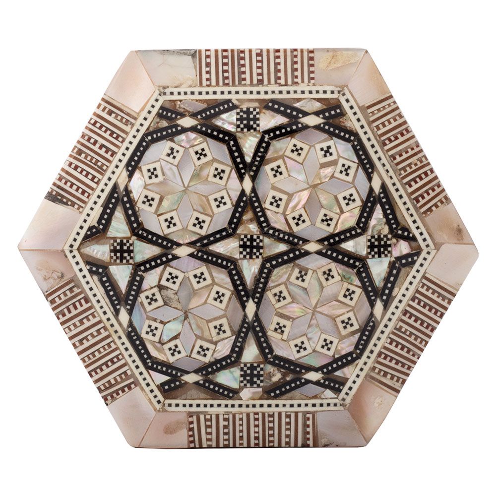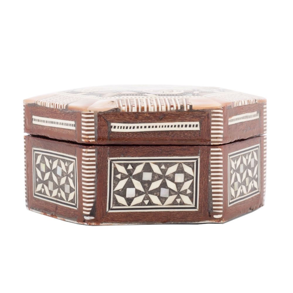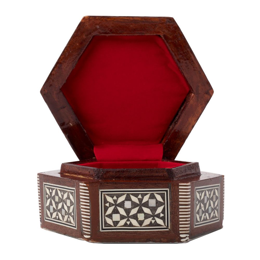 Deluxe Islamic small wooden antique box is hand-made with Master quality mahogany wood that is well known for its strength, beautiful colors and smooth structure and surface. The box is made into hexagonal shape with artistic ornaments of Arabesque art style. It is hand-inlaid with rare precious mother-of-pearl. Our talented artists only work with full natural materials to reflect the value and the uniqueness of the handcrafted pieces. The mother-of-pearl are mainly extracted from molluscan shells, and made up from the outer coating of pearls. The Nacre tesserae are cut into small pieces with different shapes, and then the shapes are painted with natural colors.